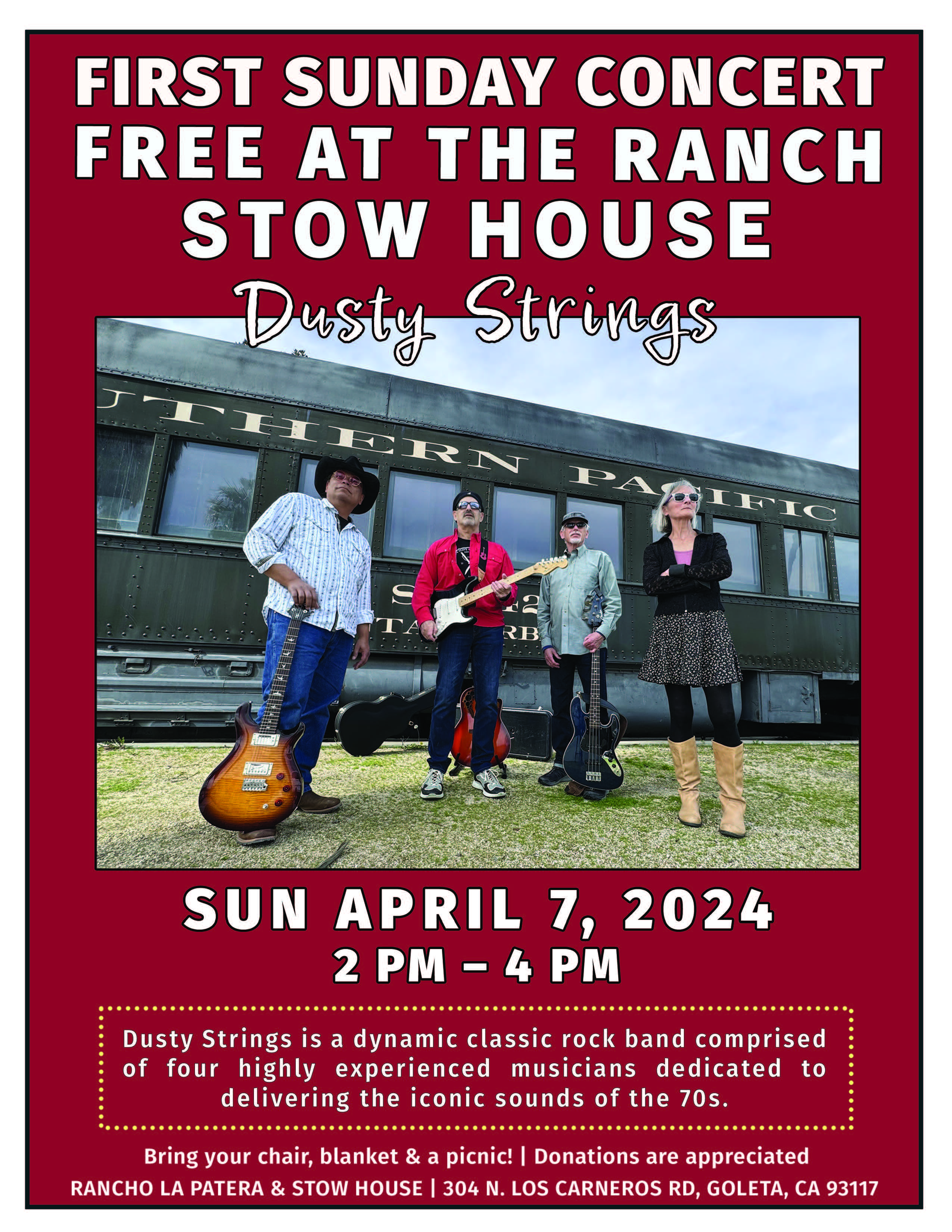 Join the Goleta Valley Historical Society as we welcome Dusty Strings to the Stow House lawn! Dusty Strings is a dynamic classic rock band comprised of four highly experienced musicians dedicated to delivering the iconic sounds of the 70s. Tell your friends to tag along and bring your chairs, blanket, and a picnic!