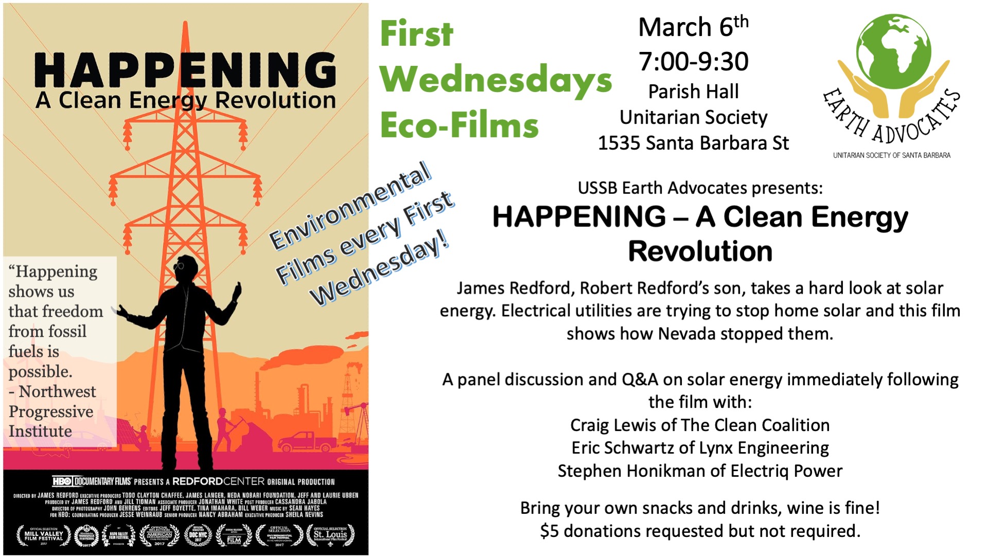 Every First Wednesday night the Earth Advocates will show an Eco-Film. This month is Happening: A Clean Energy Revolution. James Redford, Robert Redford’s son, made this documentary about the largest change in the world – the move to clean energy. the documentary is good at explaining what is going on in the clean energy industry and how entrenched interests are trying to stop the change.