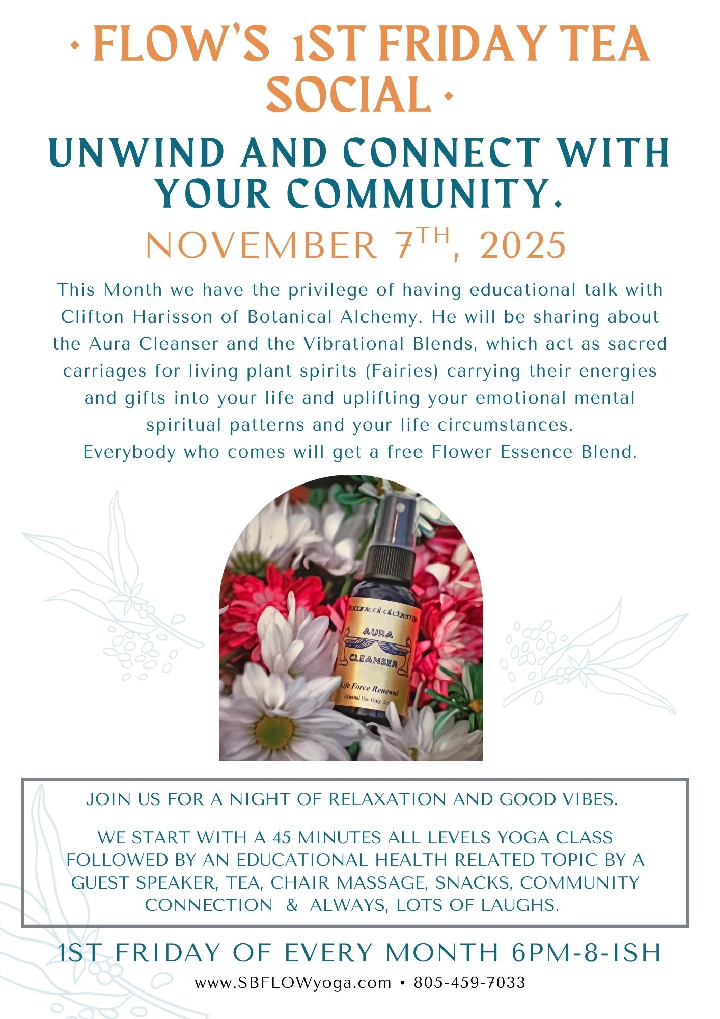 Flow’s 1st Friday Yoga & Tea Social- Special Guest, Homeopath Clifton Harrison of Botanical Alchemy