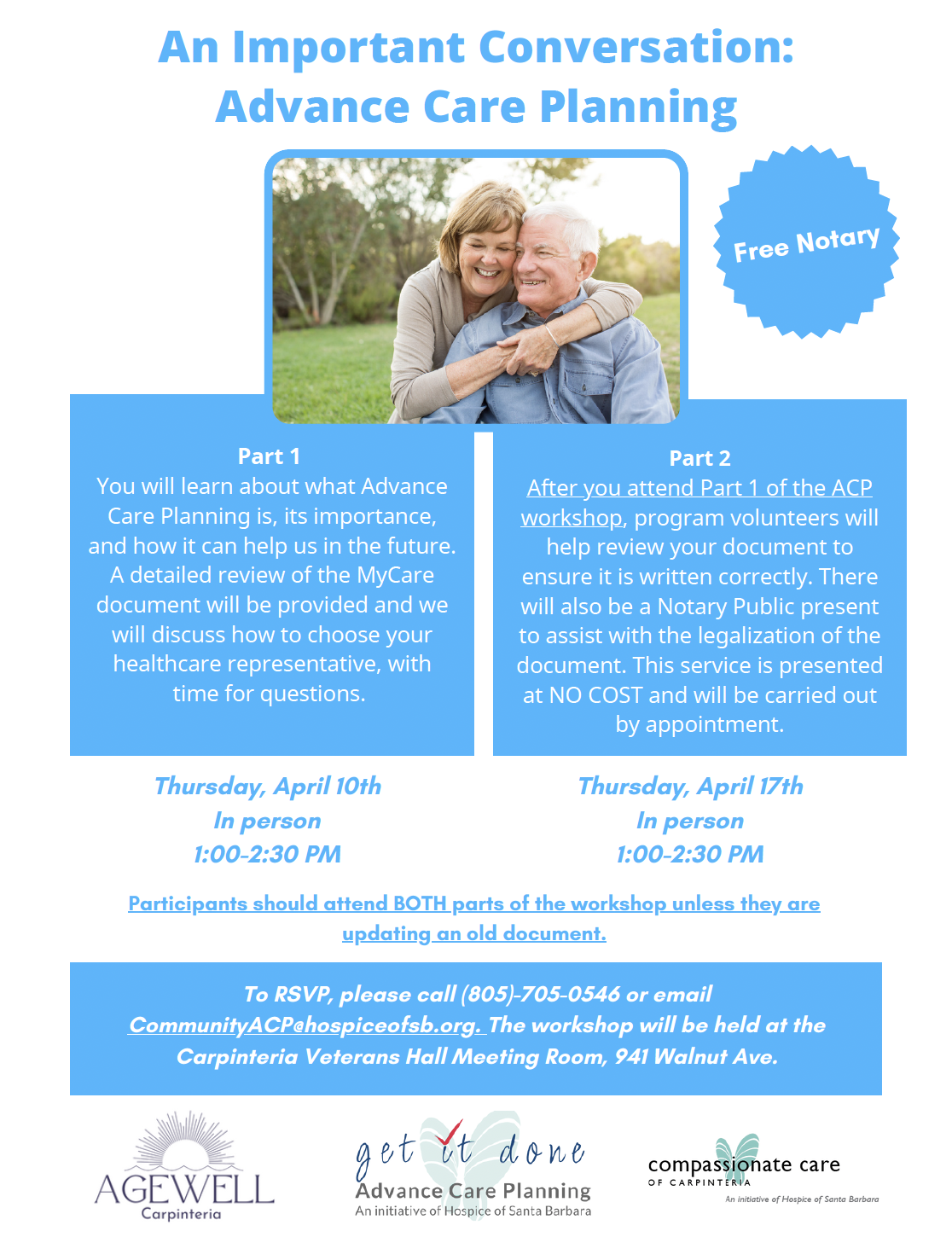 This program is free and open to the public. To RSVP, please call (805)-705-0546 or email CommunityACP@hospiceofsb.org. We look forward to seeing you there.