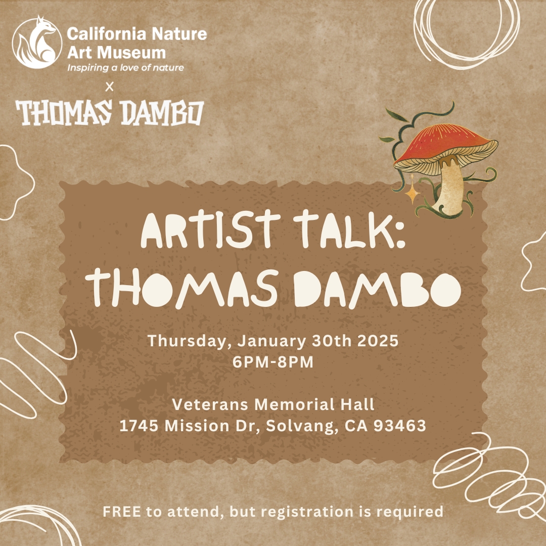 This artist talk is FREE to the public, but advance registration is required. To register, please email Assistant Director Rachel Metz at rachel@calnatureartmuseum.org