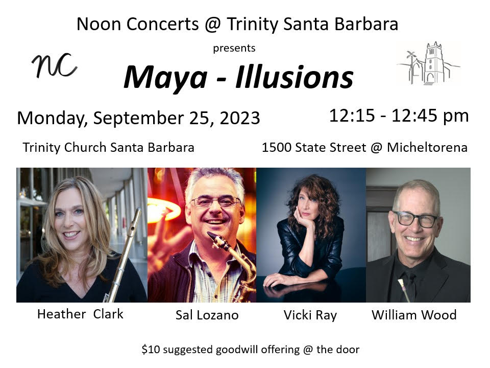 Noon Concerts at Trinity Santa Barbara starts the fall season on Monday, September 25, 12:15-12:45 pm. Heather Clark, flute; Sal Lozano, flute/saxophone; Vicki Ray, piano and William Wood, bassoon present a diverse program with works by Georg Phillip Teleman, Ian Clarke, Craig Phillips, Astor Piazzolla, Johnny Mandel/Johnny Mercer, Tchaikovsky/arr. Sandy Kipp Iles and Scott Joplin. Please join us for a thirty minute concert of Mindful Midday Music.
