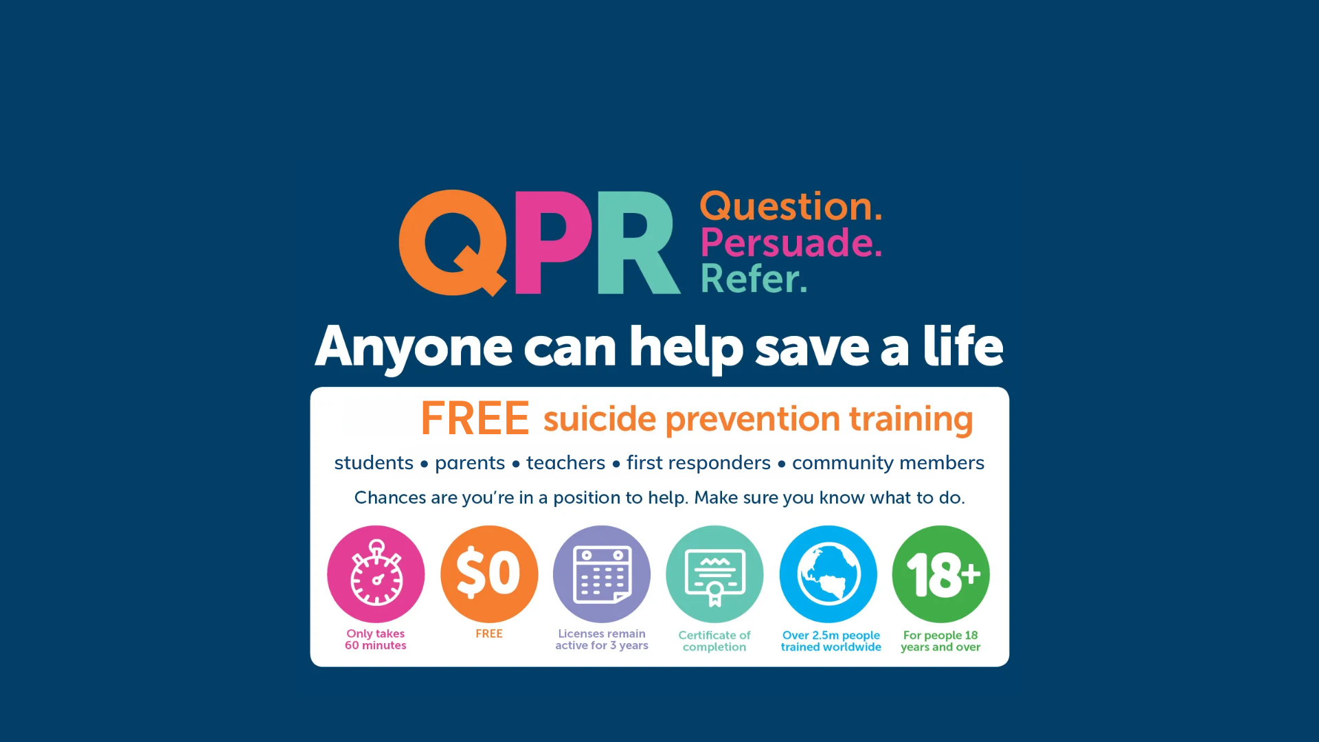 QPR stands for Question, Persuade, and Refer—three simple steps anyone can learn. Just as people trained in CPR help save thousands of lives each year, people trained in QPR learn how to recognize the warning signs of a suicide crisis. Participants will learn to recognize the warning signs of suicide, how to offer hope, and how to get help and save a life.