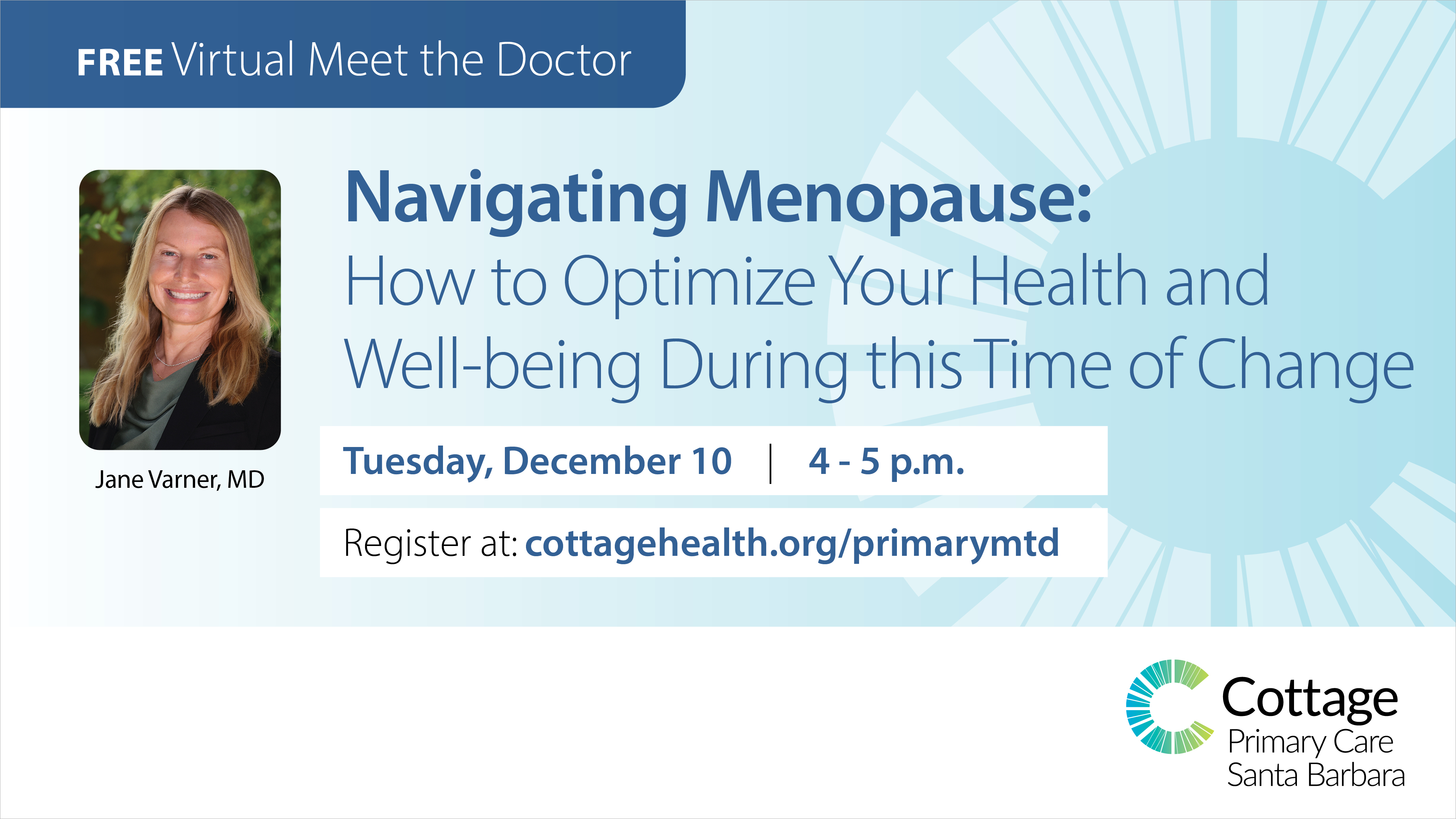 Featuring primary care physician, Jane Varner, MD who will discuss “Navigating Menopause: How to Optimize Your Health and Well-being During This Time of Change.”