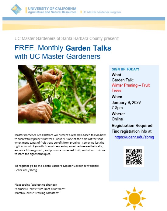 Santa Barbara Master Gardener Ken Falstrom will present a research-based talk on how to successfully prune fruit trees. January is one of the times of the year when many types of fruit trees benefit from pruning. Removing just the right amount of growth from a tree can improve the tree aesthetically, enhance future growth, and promote increased fruit production. Join us to learn the right techniques.
