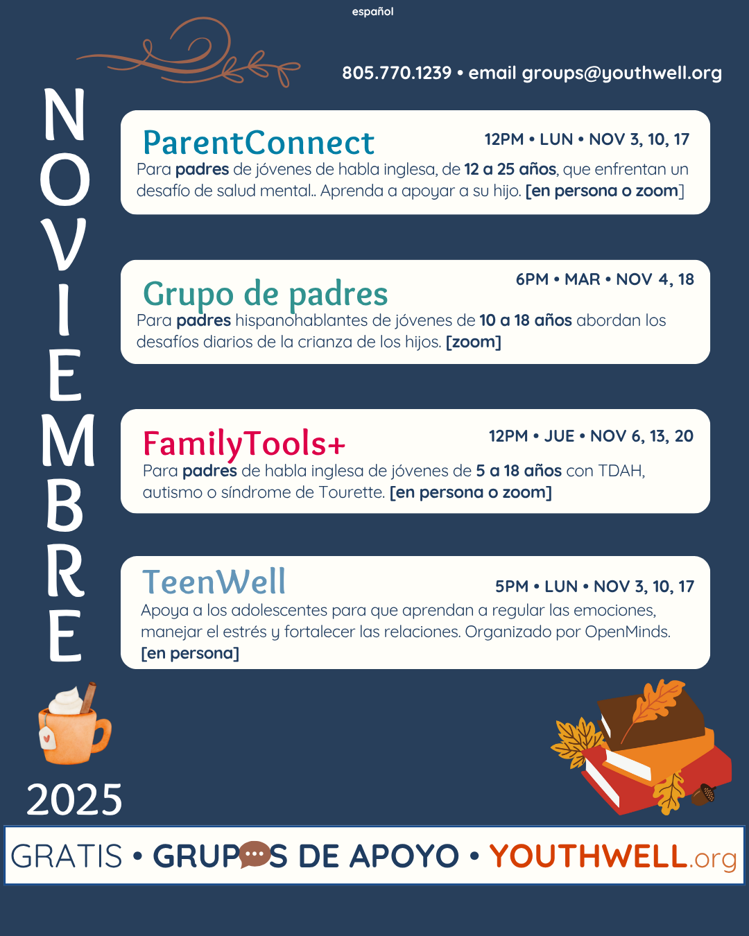 Grupo de apoyo para padres de jóvenes hispanohablantes, de 10 a 18 años, que se lleva a cabo semanalmente en persona en Santa Bárbara. Support group for Spanish speaking parents of youth, ages 10-18, held weekly in-person in Santa Barbara.