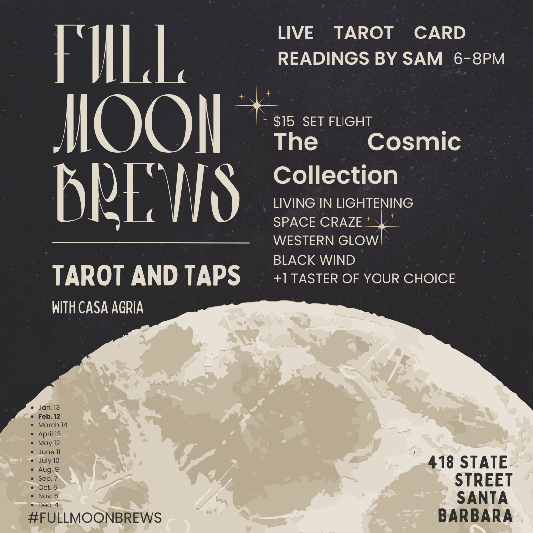 Enjoy Tarot Readings by Sam, a Cosmic Collection set flight of 4 space-themed beers, and our heater-filled patio under the full moon. Sip, savor, and discover your destiny with us! 🍺🔮🌌