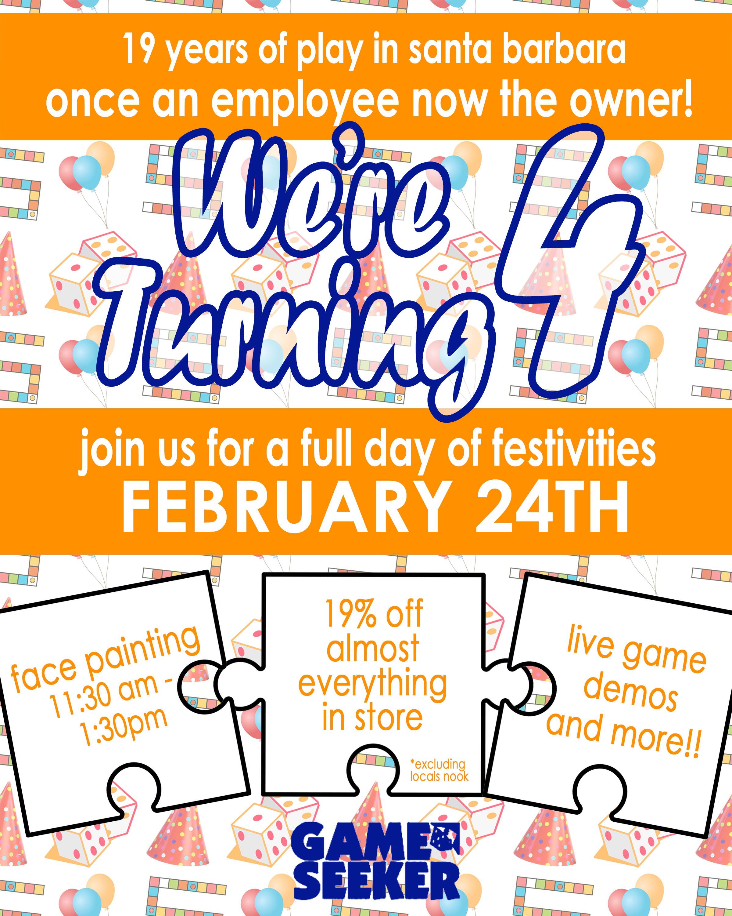 Join us on Saturday, February 24th as we CELEBRATE 4 years of new ownership at GameSeeker! Santa Barbara’s premier game store!