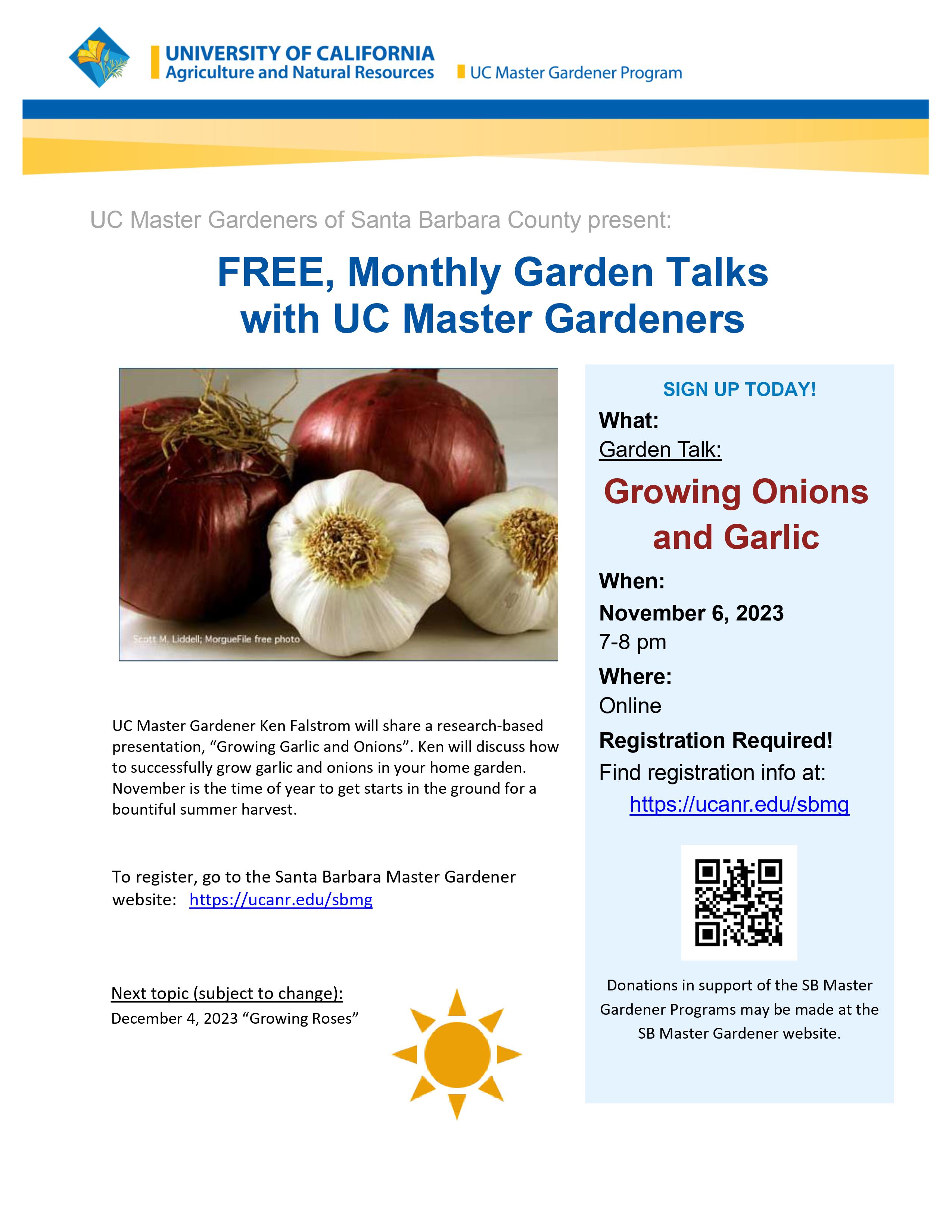 FREE, Monthly Garden Talks with UC Master Gardeners. UC Master Gardener Ken Falstrom will share a research-based presentation, “Growing Garlic and Onions”. Ken will discuss how to successfully grow garlic and onions in your home garden.