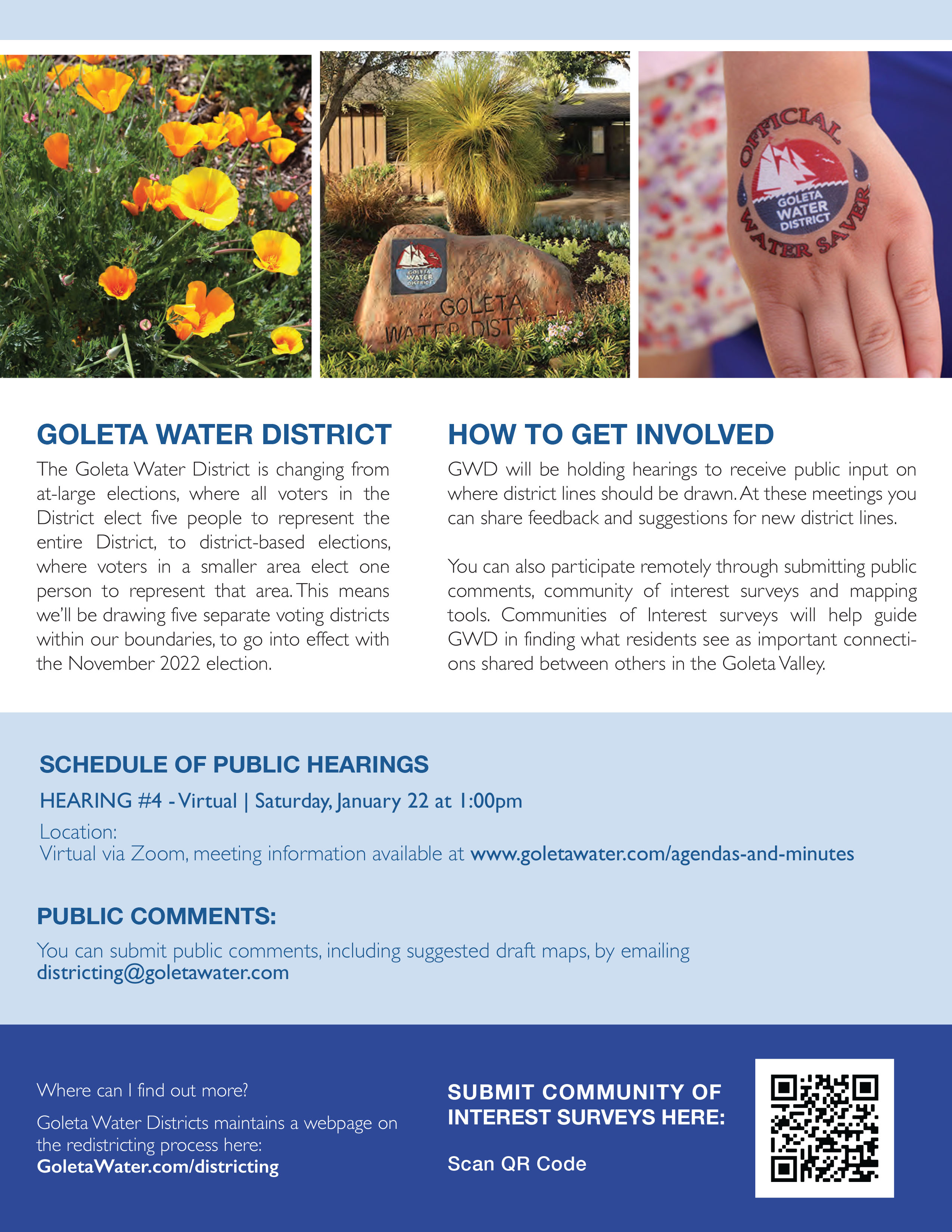 Goleta Water District (GWD) will be reviewing and discussing draft maps for its November 2022 district-based elections at the upcoming virtual hearing Saturday, January 22, 2022, at 1 P.M.