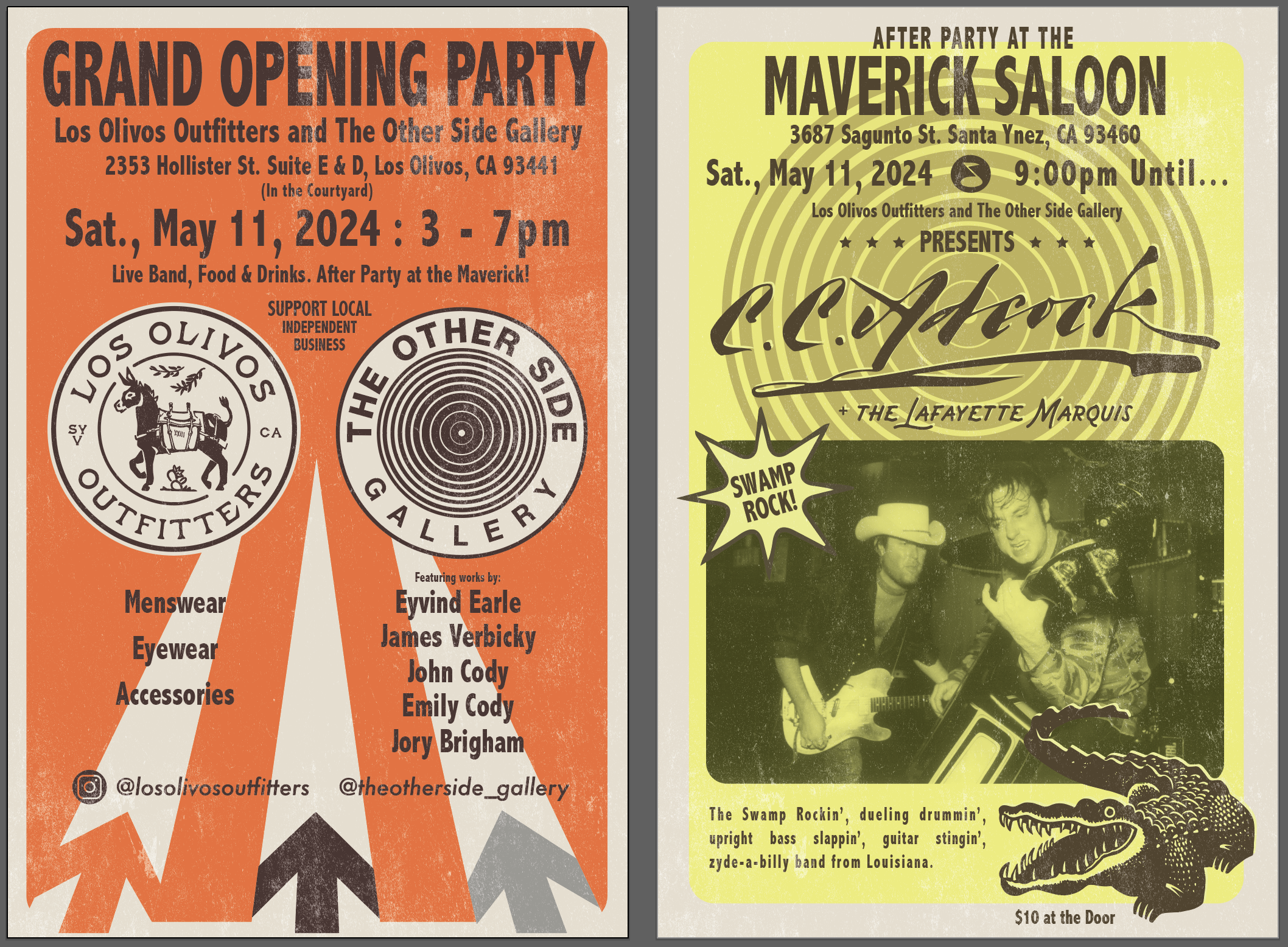 Grand Opening for Los Olivos Outfitters and The Other Side Gallery. A new Menswear Boutique and Contemporary Art and Design Gallery. We will have a live band, food and drinks. The designers, Artists, Brand Owners and Shop Owners will be here to talk about their work, products, craft and inspiration behind it all. We are really excited to be opening up these two shops next door to one another. This is a kid and pet friendly event. Music will be somewhat loud, so be aware with little ones. We will be having an after party at the Maverick as well. C.C. Adcock and the Lafayette Marquis is the band that is playing. They are a well known band from Louisiana, first west coast appearance in years.  You can find us on instagram @losolivosoutfitters and @theotherside_gallery