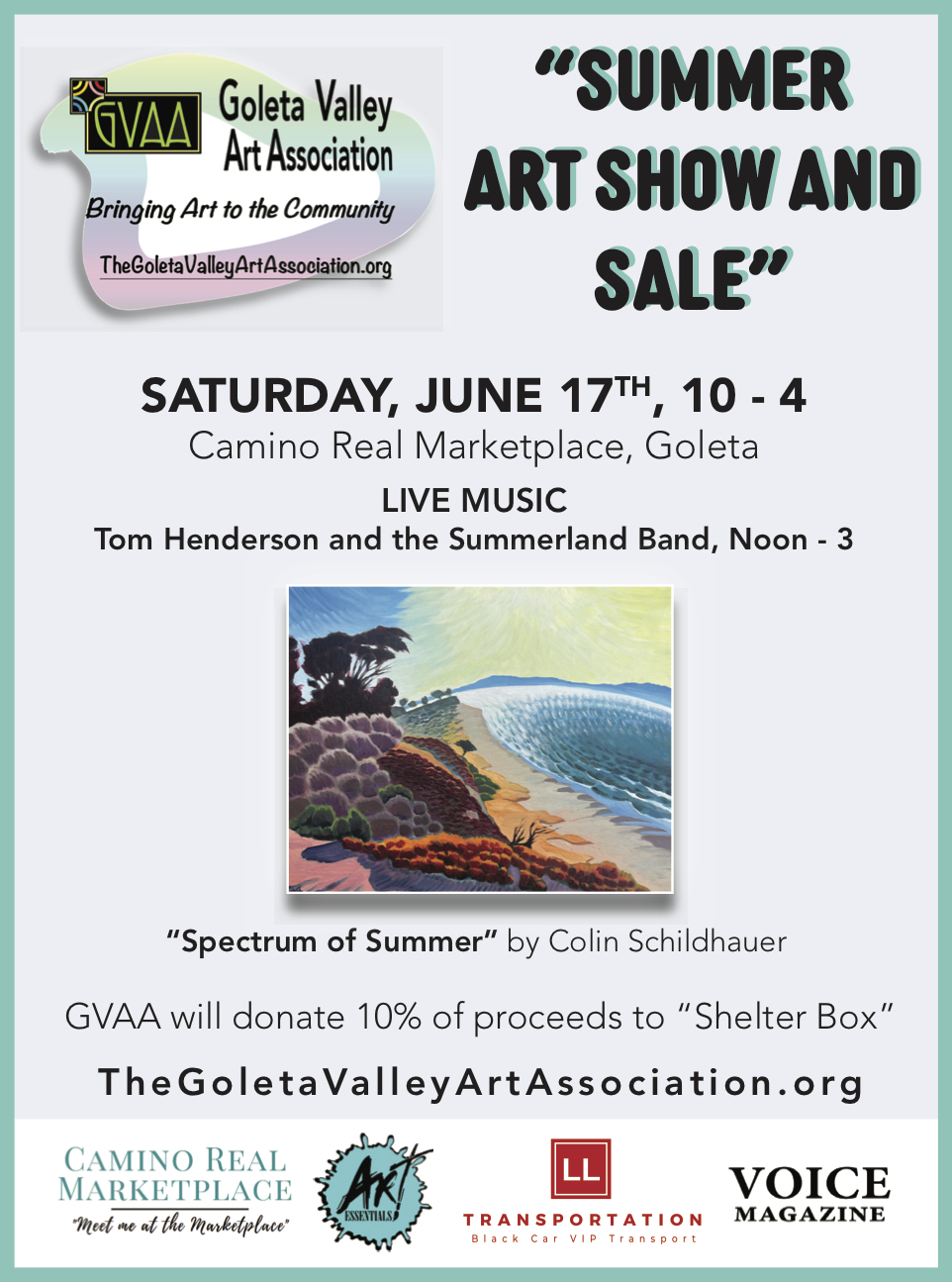 The Goleta Valley Art Association will mount its second Summer Show and Sale at the Marketplace, an art festival featuring original works by local artists on Saturday, June 17, from 10 a.m. to 4 p.m. at Camino Real Marketplace in Goleta. Sponsors include Art Essentials, Camino Real Marketplace, Limousine Link and The Voice Magazine.