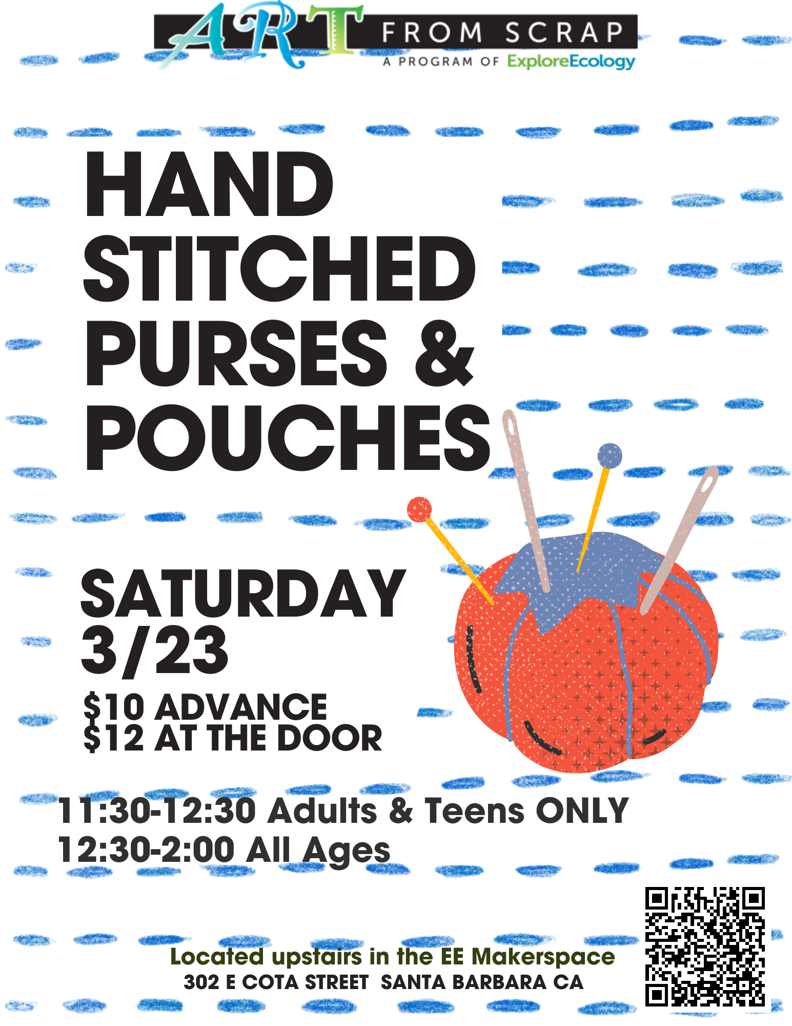 Join us for an all ages workshop to create one of a kind hand sewn purses and pouches. Learn how to apply basic stitching techniques to craft unique handmade items.