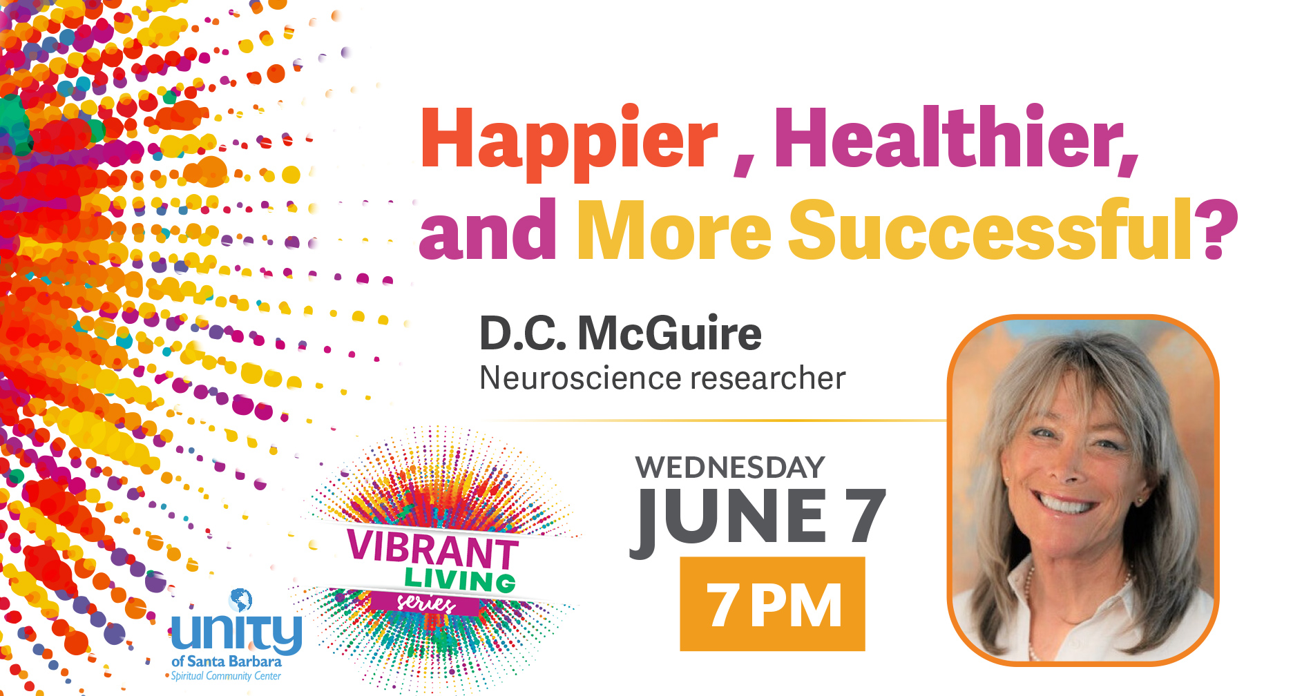 Unity of Santa Barbara’s Vibrant Living series continues on Wednesday, June 7th at 7 PM, when neuroscience researcher D.C. McGuire presents, “Happier, Healthier, and More Successful?” D.C. says, “Well, yes to all of these! By deliberately applying just a few recently discovered, naturally powerful insights about how to use our brains we can more easily and predictably enjoy the outcomes we want.”