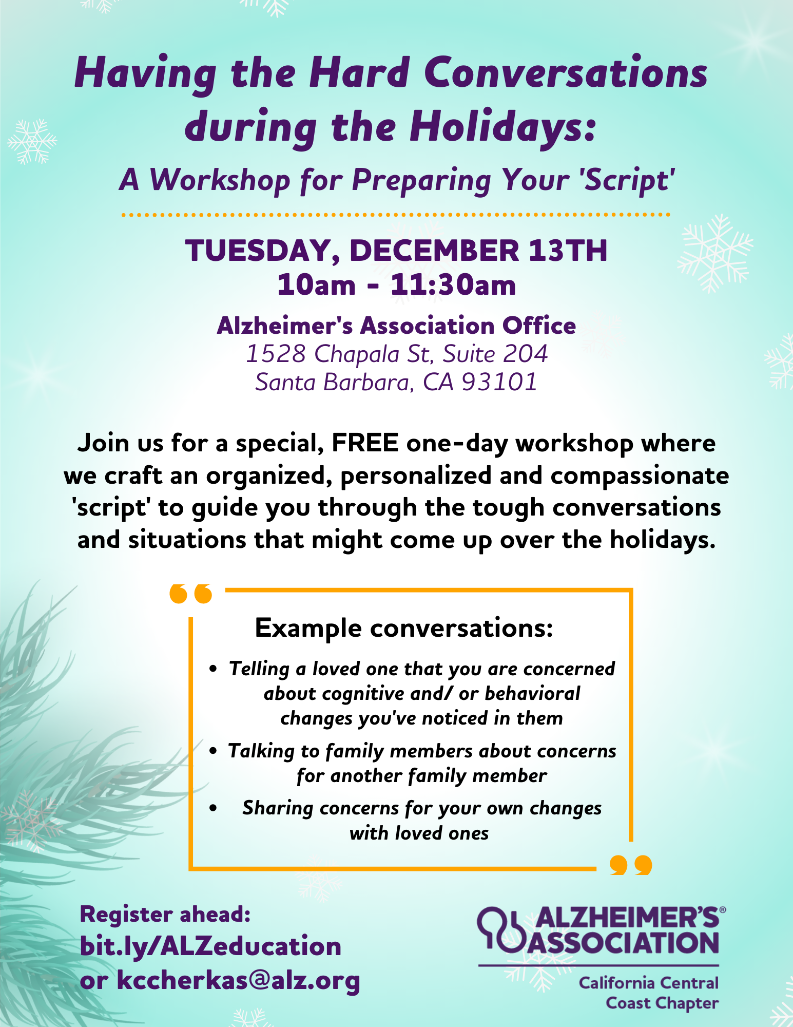 Join Kathryn Westland, MPH, Director of Programs for the Alzheimer’s Association, on Tuesday, December 13th @ 10am for a FREE workshop where we will craft an organized, personalized and compassionate ‘script’ to guide you through the tough conversations and situations that might come up over the holidays.