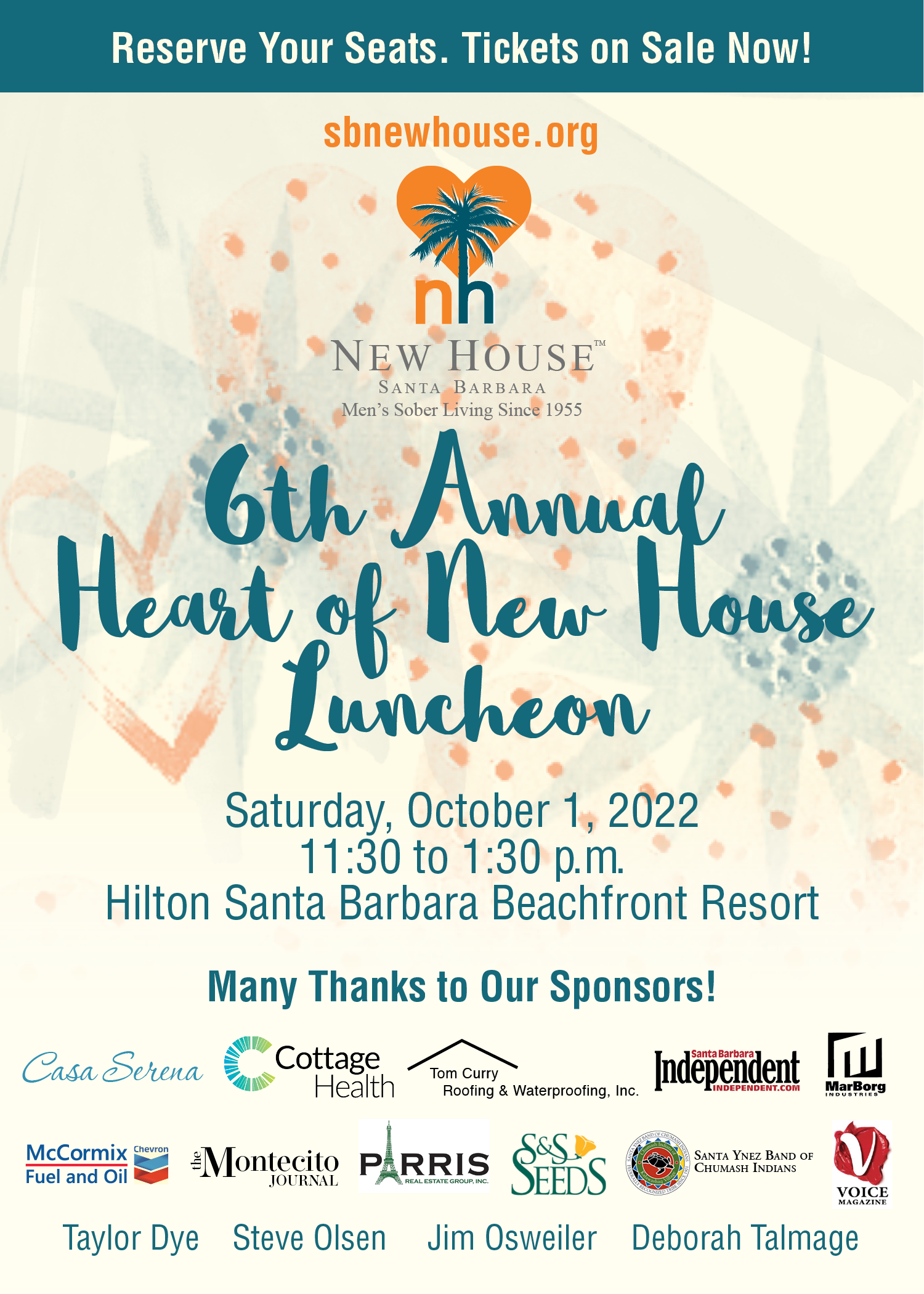 New House Santa Barbara, men’s sober living since 1955, dedicates itself to providing a safe, clean and sober environment which benefits the men in recovery as well as our community at large. The Heart of New House luncheon is the only formal fundraiser of the year. Tickets are available, and donations are accepted at sbnewhouse.org. For further information, contact Steve Olsen at steve.olsen@mccormix.com. Thank you for your open-hearted spirit of giving to help New House carry out its mission.