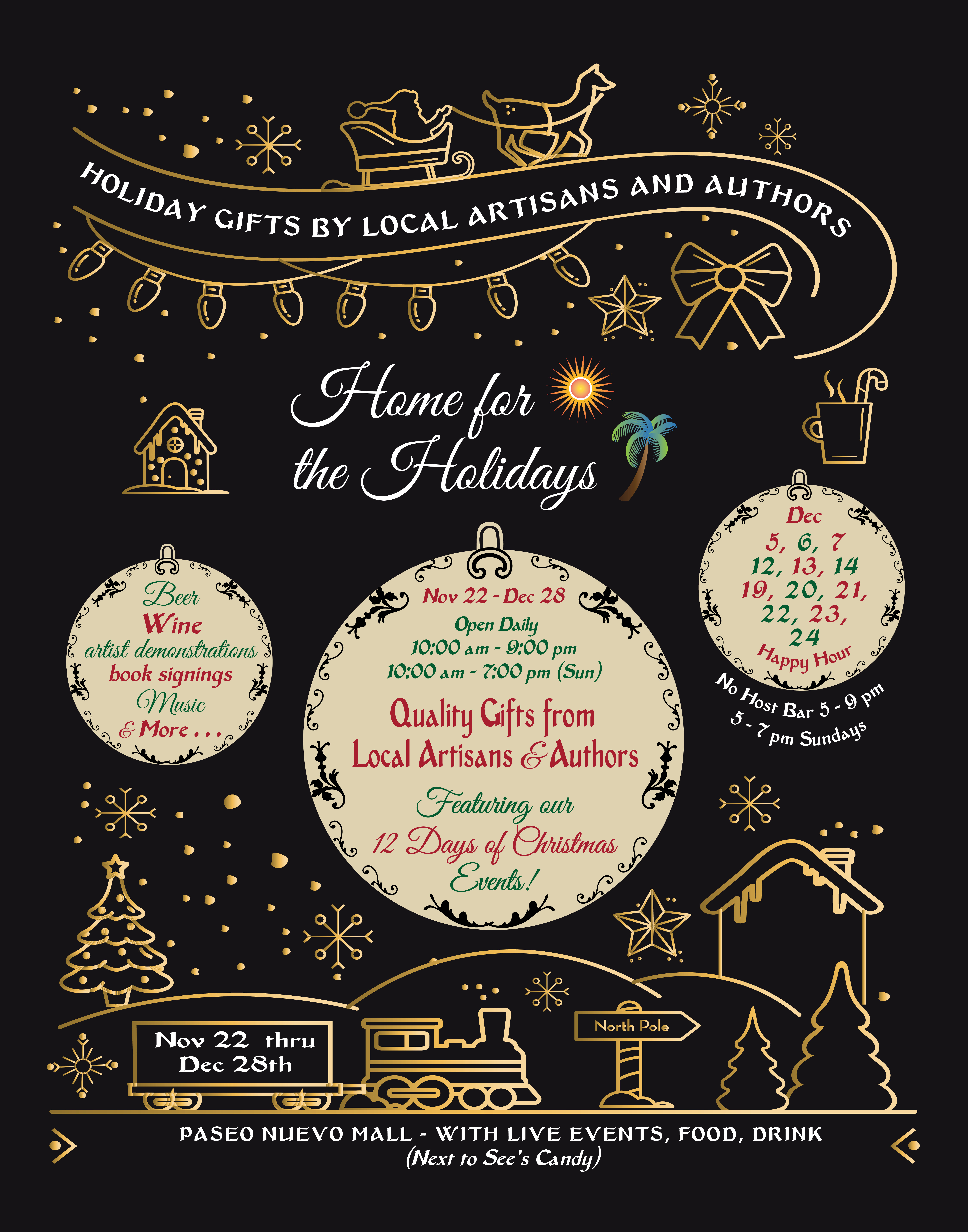 “Come on in and relish our warm and inviting atmosphere as you sip a glass of wine, sample our many delicacies, enjoy music, artist demos, and Lionel Christmas trains; shop at your leisure and find that unique gift for everyone on your list this holiday season!! Paseo Nuevo, Suite 203-next to See’s Candy; Hours: M-F 10 am – 9 pm and Sundays 10 am – 7 pm