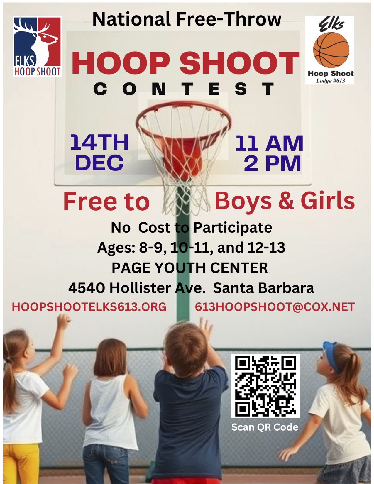 The Santa Barbara Elks Lodge #613 is conducting the National Free-Throw Hoop Shoot Contest on December 14th, 2025 from 11:00am – 2:00pm at the Page Youth Center.