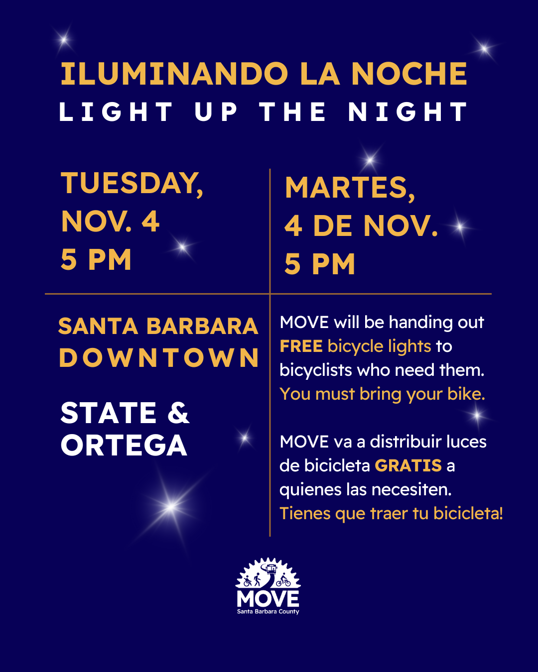 WHAT: MOVE Santa Barbara County is bringing back Iluminando La Noche (Light Up the Night), its popular bicycle light distribution campaign. On Tuesday, November 4, MOVE will be at the corner of State and W Ortega Streets in Downtown S.B. (near the former Macy’s building) handing out FREE bicycle lights to cyclists who need them most. MOVE will not only install the lights on the spot but also share quick safety tips and information about Bici Centro, MOVE’s community DIY bike repair shop at 434 Olive Street in Santa Barbara. You must bring your bike to receive a free light set.