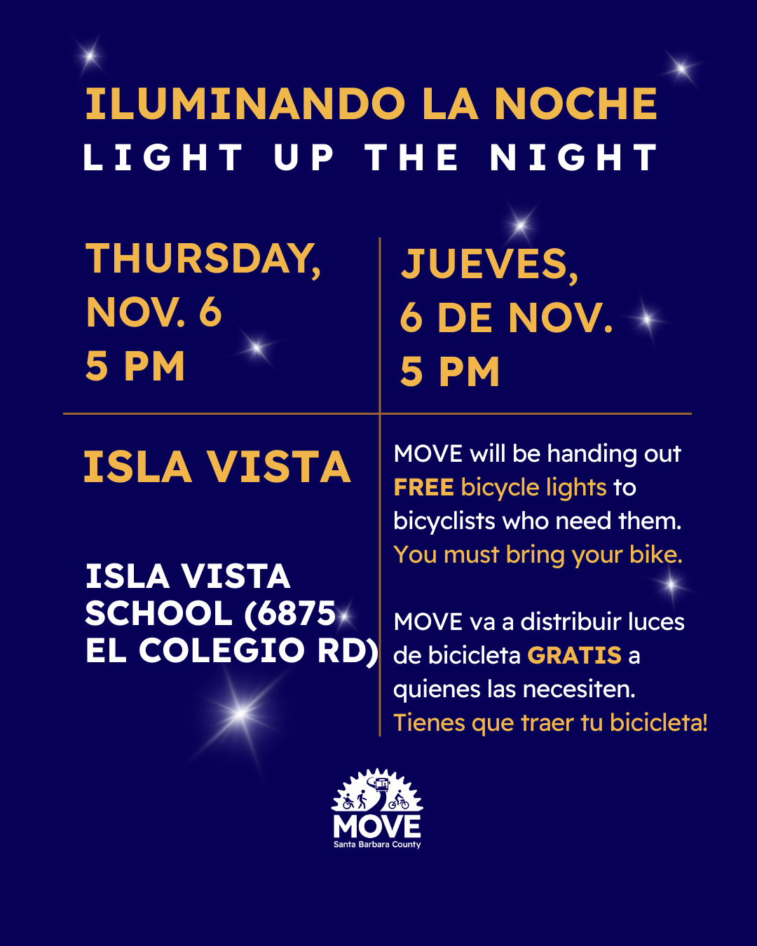 WHAT: MOVE Santa Barbara County is bringing back Iluminando La Noche (Light Up the Night), its popular bicycle light distribution campaign. On Thursday, November 6, MOVE will be in Isla Vista at Isla Vista School (6875 El Colegio Rd) handing out hundreds of FREE bicycle lights to cyclists who need them most. MOVE will not only install the lights on the spot but also share quick safety tips and information about Bici Centro, MOVE’s community DIY bike repair shop at 434 Olive Street in Santa Barbara. You must bring your bike to receive a free light set. IV School’s 5th graders will be set up next to the bike light distribution to do a bake sale to raise money for school events. This event is also supported by LEAP Central Coast.