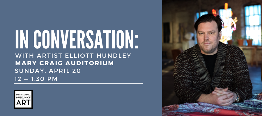 As part of the programming for Proscenium: Elliot Hundley and By Achilles’ Tomb: Elliott Hundley and Antiquity @ SBMA, exhibiting artist Elliott Hundley will join James Glisson, SBMA Chief Curator and Curator of Contemporary Art, in conversation.