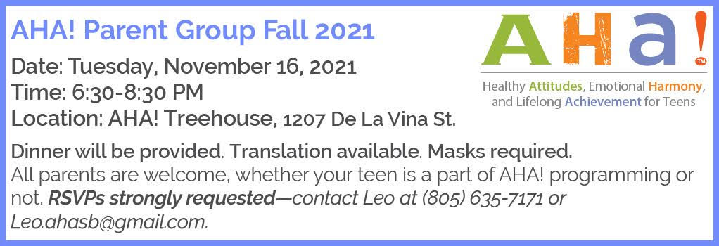 Si su hijo adolescente ya forma parte de AHA! o si tiene curiosidad acerca de programas AHA! para su hijo … ¡esta es una oportunidad de experimentar la magia de un grupo AHA! para usted mismo!