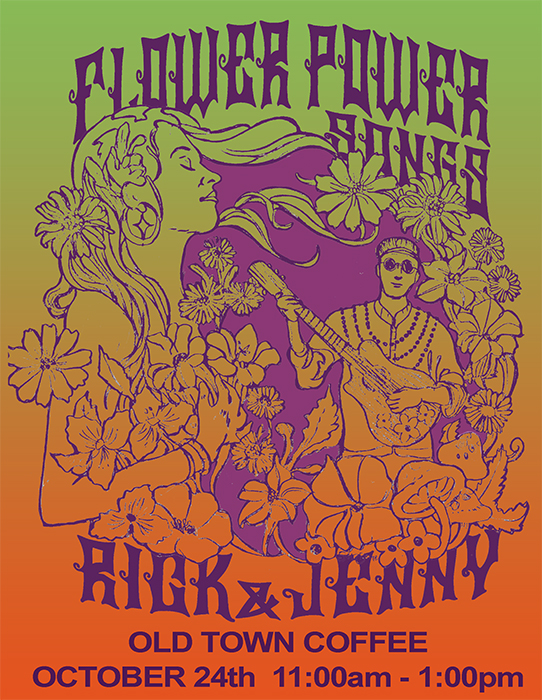 Rick and Jenny will perform groovy 60’s Flower Power songs this Sunday, Oct. 24th from 11:00 – 12:00 at Old Town Coffee, 5877 Hollister Ave. in Goleta.
