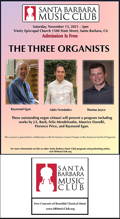 On Saturday, November 13 at 3 p.m. the Santa Barbara Music Club, in collaboration with the American Guild of Organists, will present its first program since February 2020. Organists Raymond Egan, Adán Fernández, and Thomas Joyce will present a program including works by J.S. Bach, Felix Mendelssohn, Maurice Duruflé, Florence Price, and Raymond Egan. This concert will be held at Trinity Episcopal Church, 1500 State Street, Santa Barbara. Admission is free.