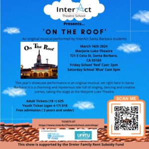 InterAct’s annual showcase performance this year is an original musical, set right here in Santa Barbara! It is a charming and mysterious tale full of singing, dancing and creative scenes, taking the stage at the Marjorie Luke Theatre. Come and support local youth theatre at either of our TWO performances on March 16th at 2pm OR 5pm. Bring friends!
