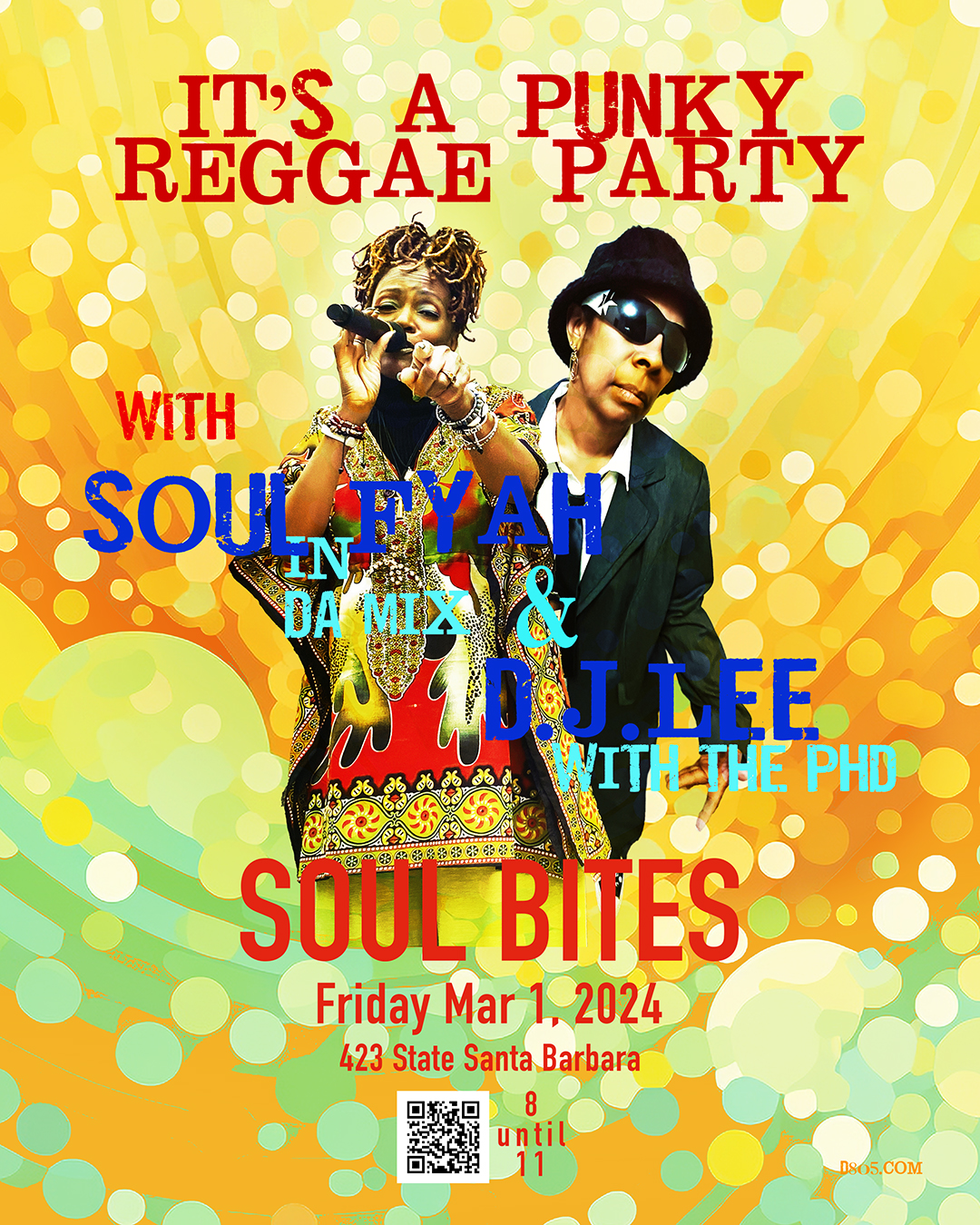 It’s a Punky Reggae Party with Soul Fyah In Da Mix and DJ Lee with the PhD at Soul Bites Restaurant and Music Venue located at 423 State Street, Santa Barbara, Friday March 1.