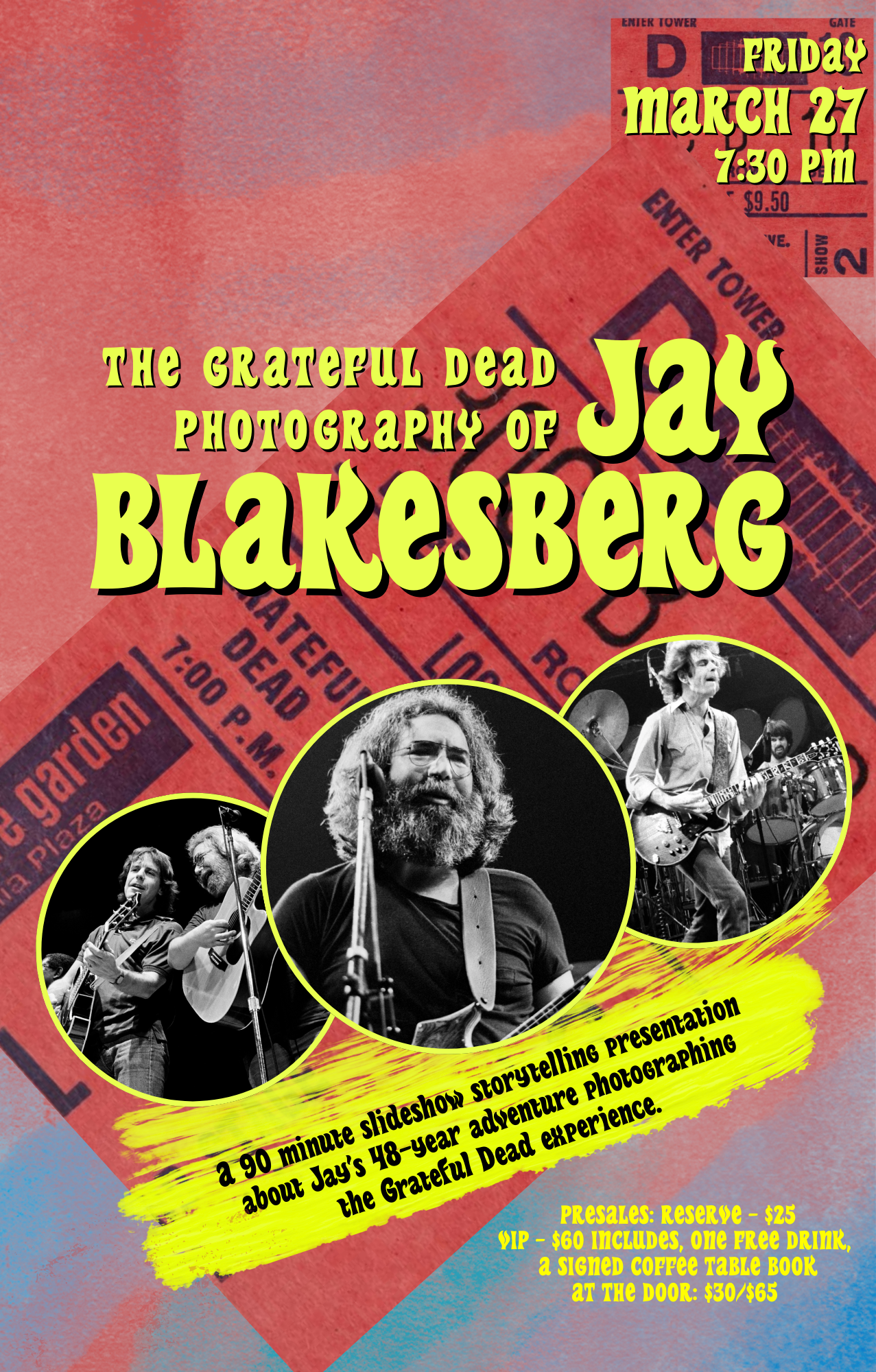 A 90 minute slideshow storytelling presentation about Jay’s 48 year adventure photographing the Grateful Dead experience.