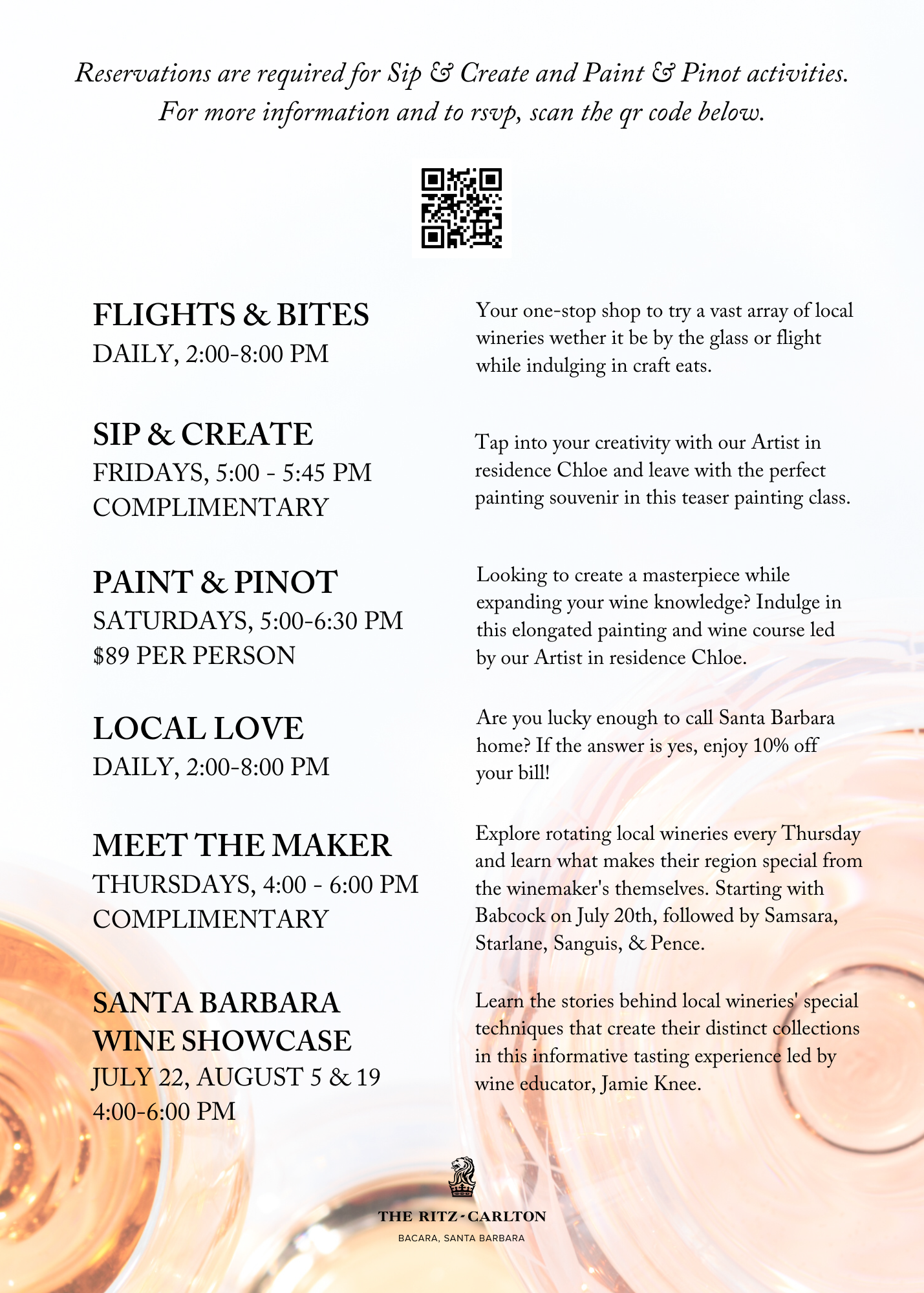Join us at the Ritz-Carlton Bacara, Santa Barbara to learn the stories behind local wineries’ special techniques that create their distinct collections in this informative tasting experience led by wine educator, Jamie Knee.