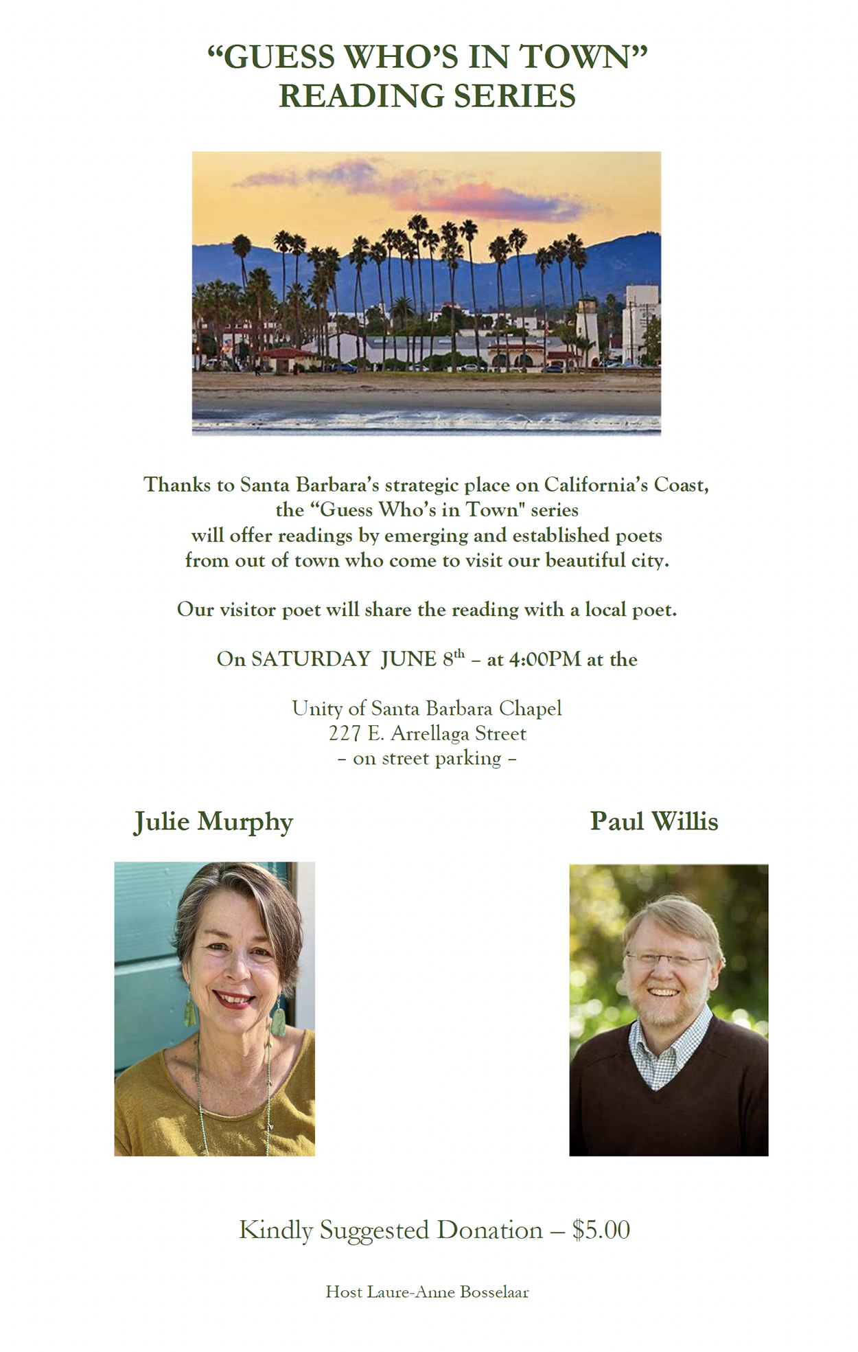 Thanks to Santa Barbara’s strategic place on California’s Coast, the “Guess Who’s in Town” series, hosted by former SB Poet Laureate Laure-Anne Bosselaar, offers readings by emerging and established poets from out of town who come to visit our beautiful city. Our visitor poet will share the reading with a local poet.