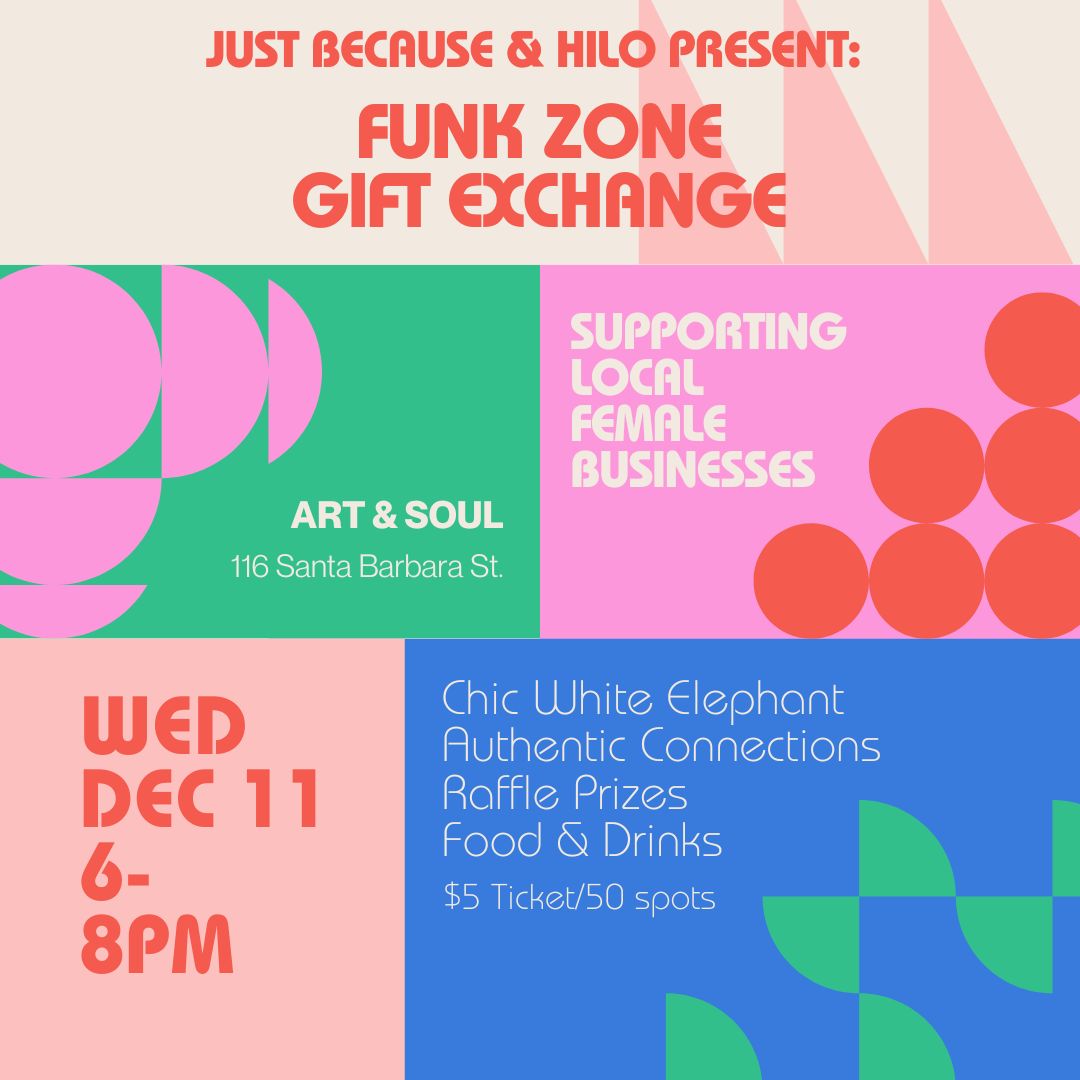 Just Because x HILO invite you to a Funk Zone Gift Exchange! A fun-filled & festive evening to eat, drink, be merry and dive below the surface as we explore the ways we find intimacy in giving and receiving in our community.