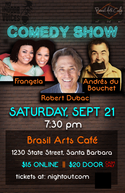 NO INDOOR VOICES kicks off the season with another stellar line up of Robert Dubac who draws on decades of showbiz experience as a writer, actor and stand-up comic to create solo shows that explore social mores, political ideas, and the complexity of the human experience with unparalleled humor that is both intelligent and absurd. A NIV favorite, comedy writer for Conan O’Brien Andres du Bouchet and the spectacular political, comedy duo Frangella! They are the hosts of TV’s newest daytime talk show: Me Time with Frangela. Frangela is known for NBC’s I’m A Celebrity Get Me Out of Here. They were featured on The Oprah Show on the “Best Standups in America” episode