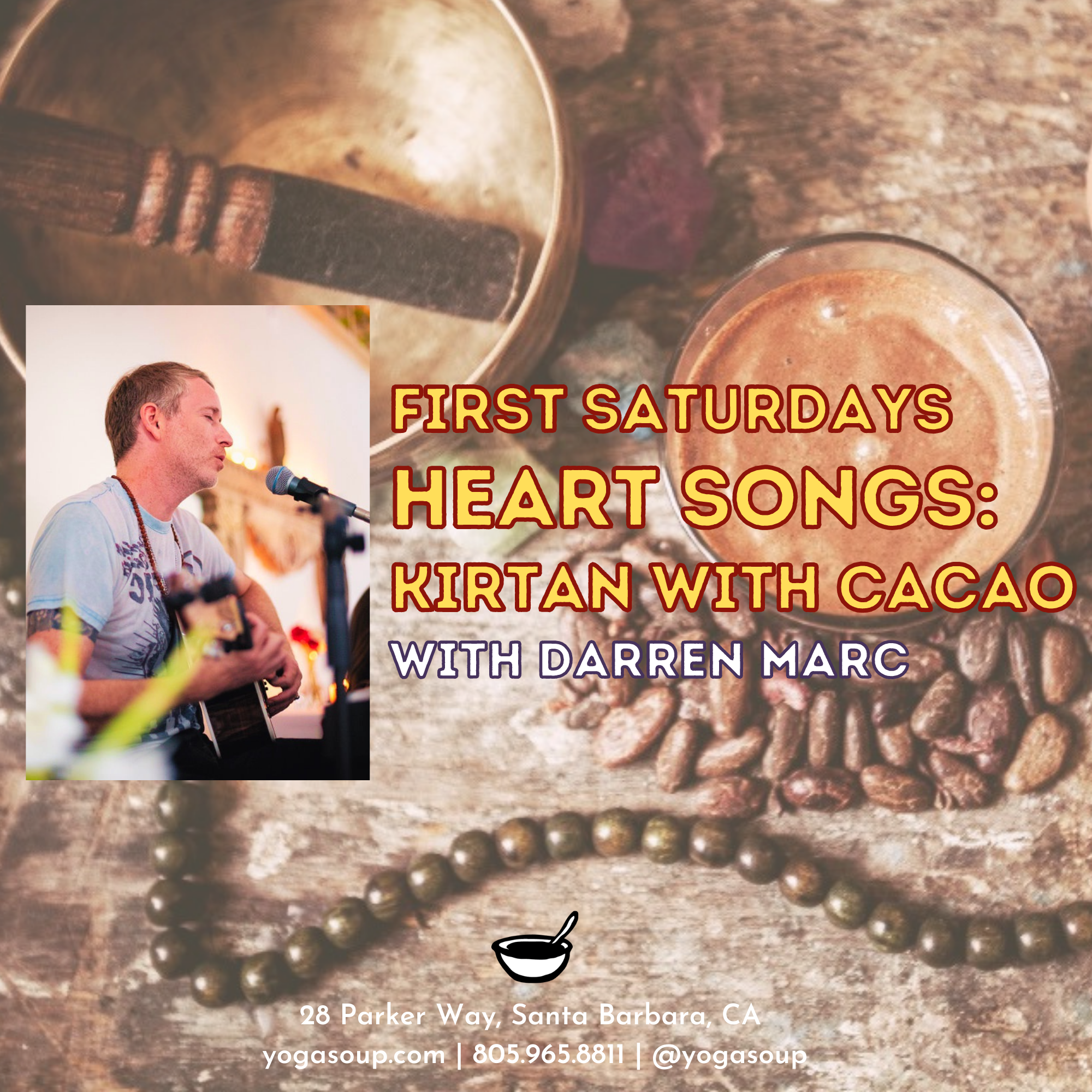 During this sacred gathering, Darren (often with guest musicians) weaves together call and response singing (kirtan), a cacao ceremony, and heart-centered infused spiritual teachings to create a magical, uplifting experience.