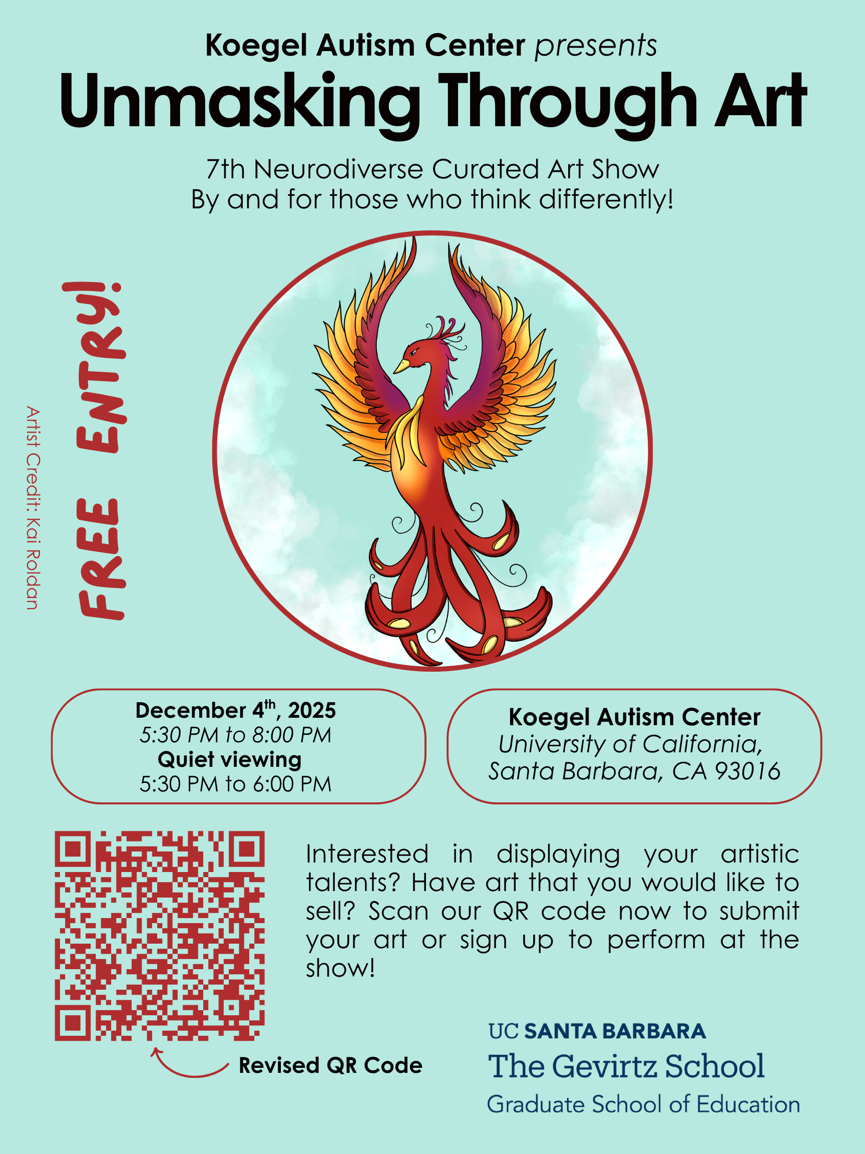 The Koegel Autism Center’s Creative Club will be holding its seventh neurodivergent art show, by and for those who think differently. Titled “Unmasking Through Art,” the show will open with a reception on Thursday, December 4, from 5:30 pm to 8:00 pm at the Koegel Autism Center on the UC Santa Barbara campus. Quiet viewing will be available from 5:30 pm to 6:00 pm. This event is free and open to the public.