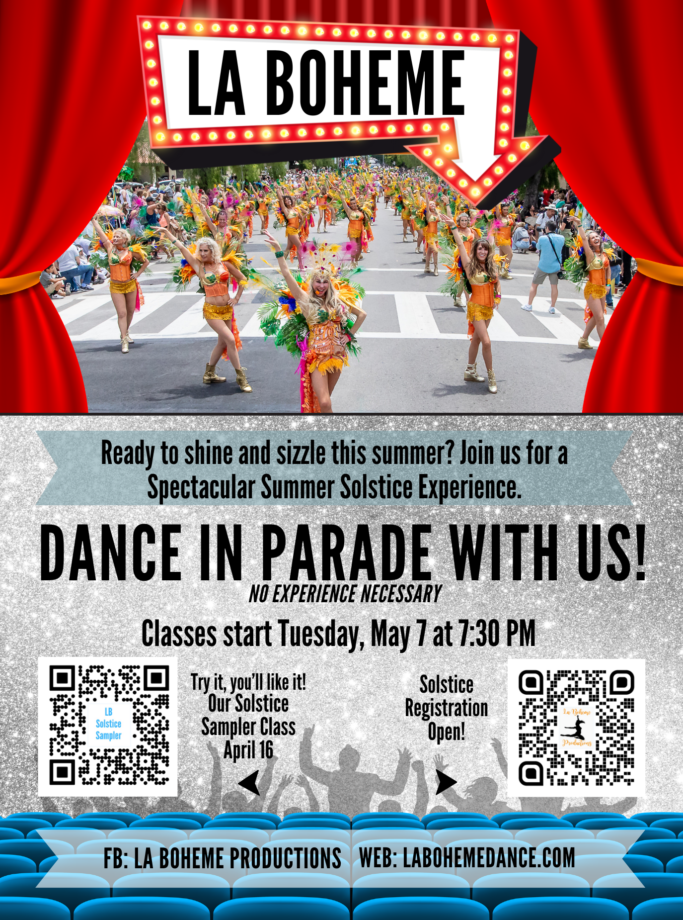 For the first time in 10 years La Boheme is offering a “Solstice Sampler” class for those who are curious about dancing in the Summer Solstice parade with us on Saturday, June 22. This exclusive single class serves as a tantalizing taste of what awaits you on May 7, a prelude to our enchanting 7-week Solstice journey. Whether you’re a seasoned dancer or a curious newbie, all are welcome to join us for this special evening and for the upcoming Solstice experience!