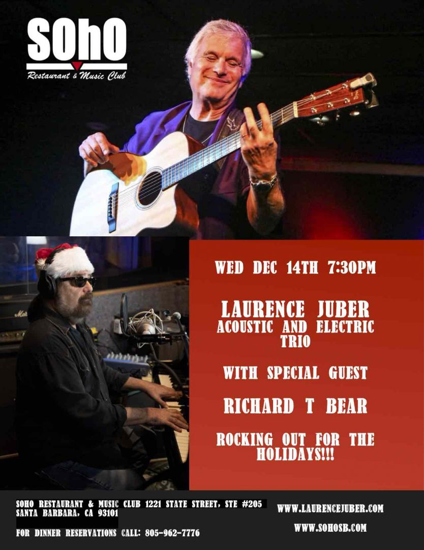 Laurence Juber returns to SOHO with his trio: long-time studio collaborator Domenic Genova on upright bass/bass guitar and Christopher Allis on drums/percussion, LJ will perform on both acoustic and electric guitar, with an eclectic repertoire drawn from his own celebrated compositions and arrangements, as well as some choice Christmas tunes.