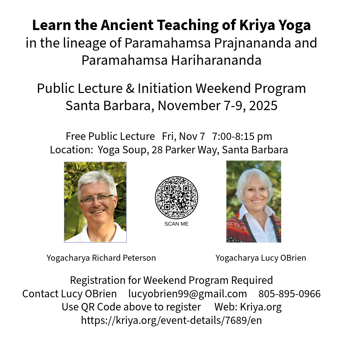 Yogacharayas Richard Peterson and Lucy O’Brien will offer Entry-Level Kriya Initiation Ceremony on the weekend, November 8 -9,  2025 in Santa Barbara, CA.   Registration is required for the weekend workshop.  All sincere students interested in learning the techniques of Kriya Yoga as practiced through the lineage of Paramahamsa Prajnanananda and Paramahamsa Hariharanananda are welcome.