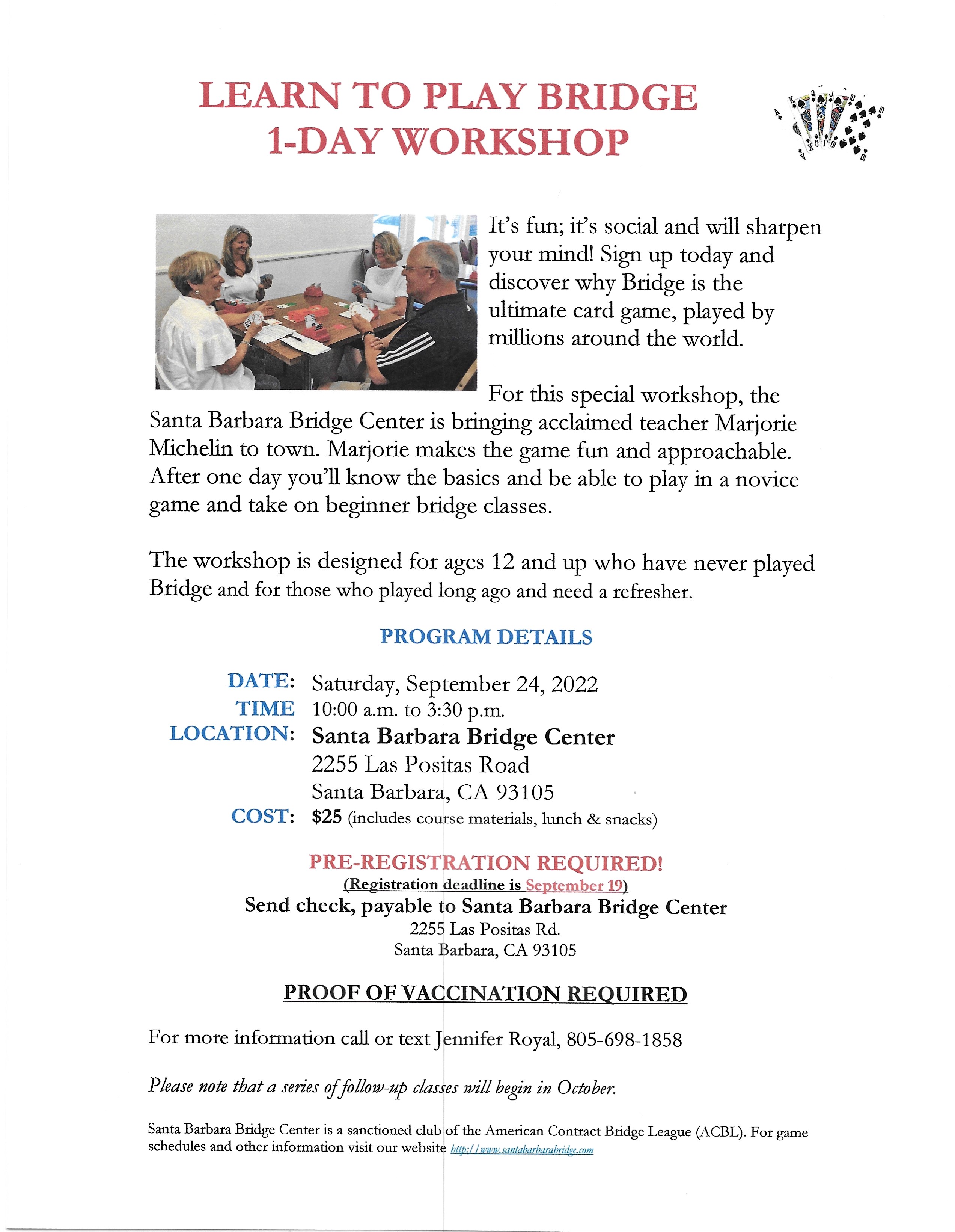 Playing Bridge is fun, it’s social and will sharpen your mind! If you have never played Bridge or have been away from the game for a long time, this workshop is for you. Acclaimed Bridge teacher Marjorie Michelin will give this special Workshop on Saturday, September 24 from 10 a.m. to 3:30 p.m. Lunch, snacks and course materials are included in the admission fee.