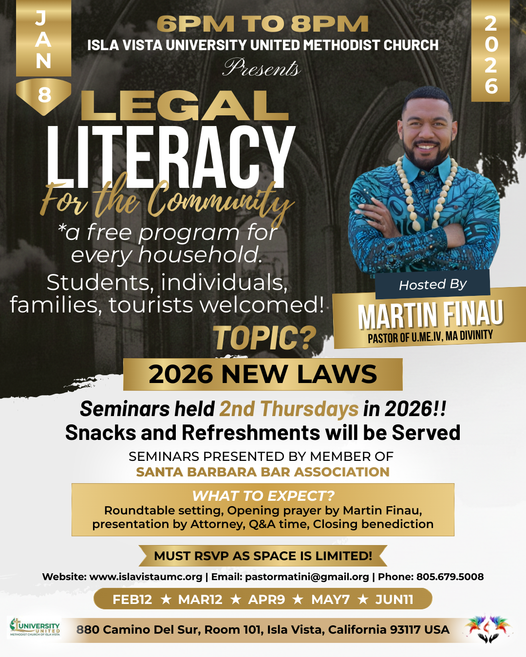 Our first seminar will focus on 2026: New Laws. Attorney will explain and help audience understand its ramifications. Seminar will start with Pastor Finau’s introduction and blessing, there will be a break followed by Q&A and ending with the benediction.