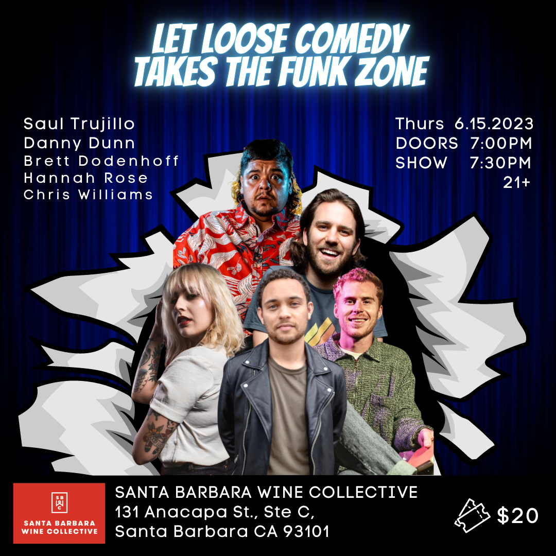 We are back for our monthly show in the Funk Zone! Join us on Thursday, 6.15.23, for a night of huge laughs and great wine as we take over Santa Barbara Wine Collective.