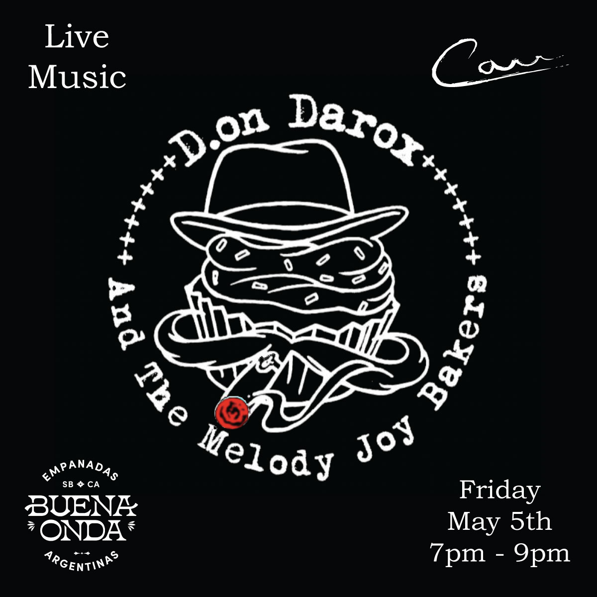 Another great night of live music is lined up for Friday, May 5th in the barrel room! Joining us will be Don Darox & The Melody Joy Bakers. They specialize in Dirty Gypsy Blues with a taste of New Orleans. First Fridays of the month are a favorite here at Carr, come ready to celebrate with a nice glass of our Carr premium wine, live music, and empanadas from Buena Onda in the barrel room. Music begins from 7:00 PM – 9:00 PM, invite your friends, celebrate the end of a great week, and Cinco de Mayo with us in the barrel room!