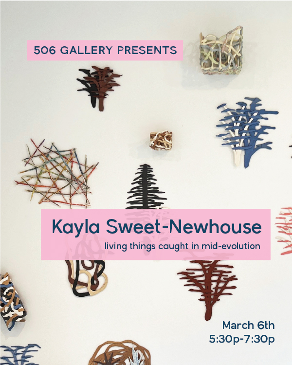 We are delighted to be showing Kayla Sweet-Newhouse’s new ceramic work at 506 Gallery and hope you will join us at her opening reception! Light snacks and refreshments will be served.