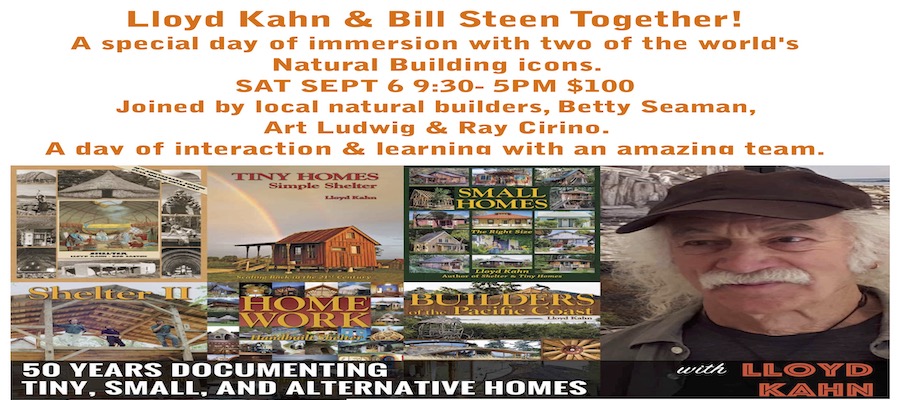 A special one day immersion with Lloyd Kahn & Bill Steen, SAT /Sept 6 9:30-5pm $100.