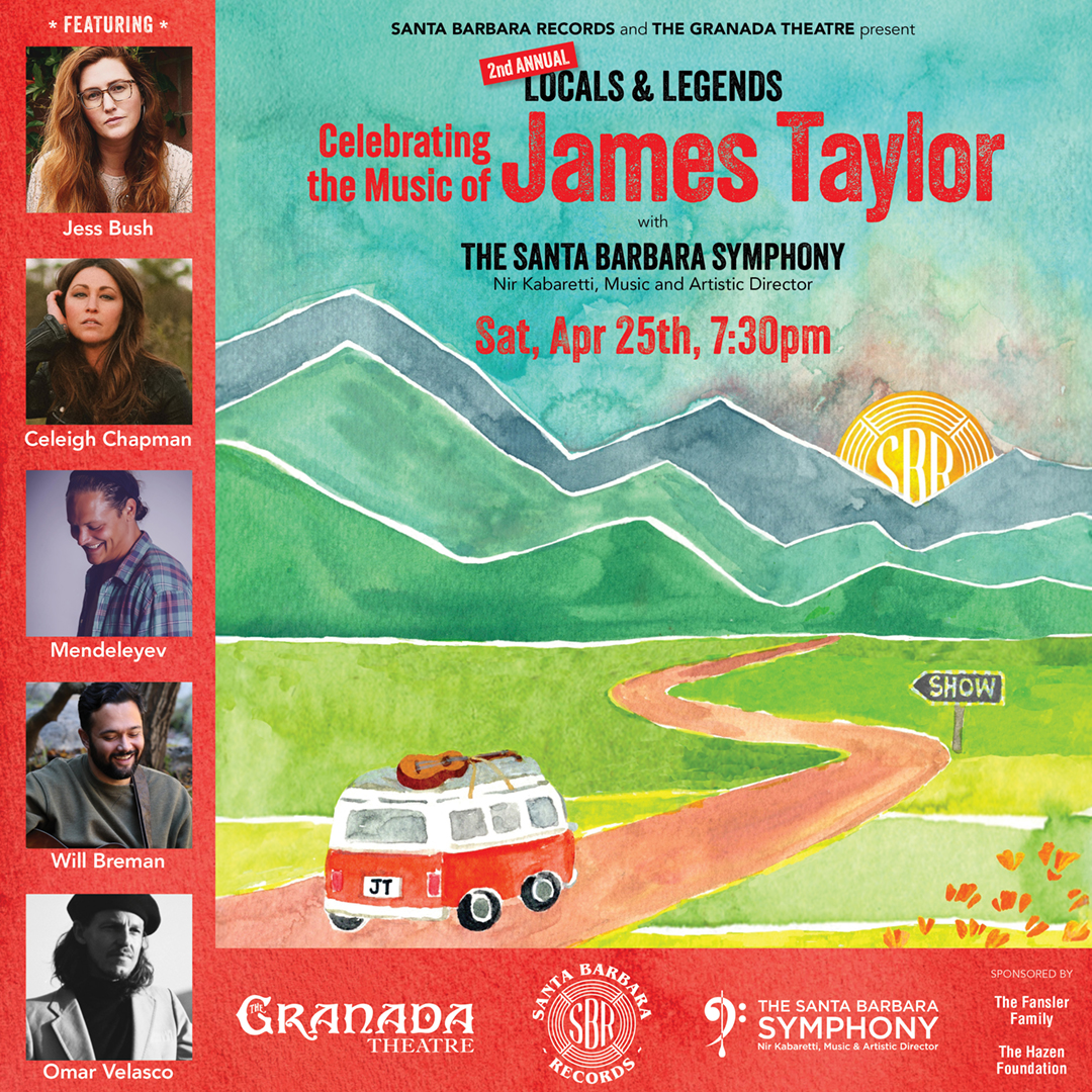 Santa Barbara Records artists, Omar Velasco, Celeigh Chapman, Mendeleyev, Will Breman, and Jess Bush, will bring Taylor’s most cherished songs to life in newly reimagined arrangements supported by The Santa Barbara Symphony under the direction of Music and Artistic Director Nir Kabaretti.