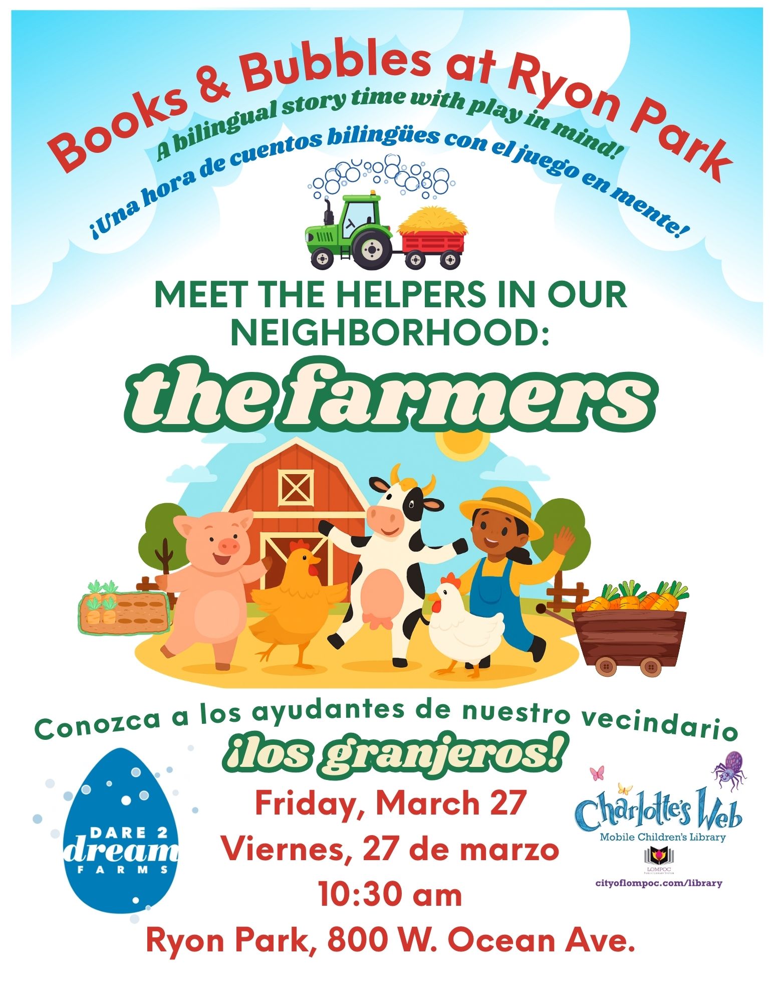 LOMPOC, CA, March 24 – The Charlotte’s Web Bookmobile children’s bilingual story time program, Books & Bubbles in the Park, invites children and their caregivers to join a special story time with special guest Megan Raff of Dare to Dream Farms.