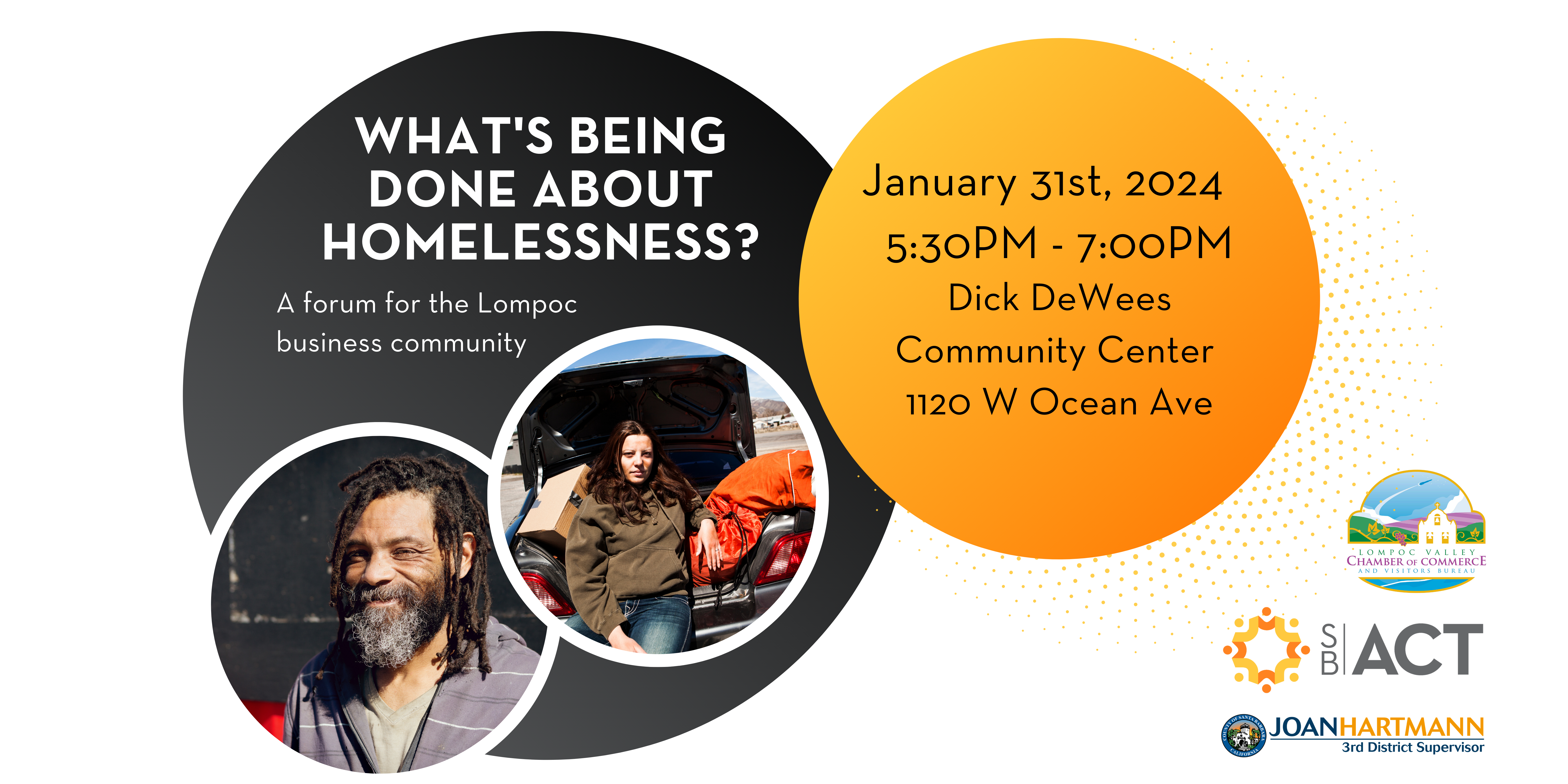 Please join SB ACT, Supervisor Joan Hartmann, the Lompoc Valley Chamber of Commerce, and local service providers on Wednesday, January 31 at 5:30pm for a discussion about how homelessness is being addressed in the Lompoc community, who is addressing it, and voice your questions and concerns.