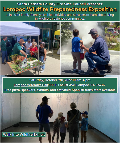 The Santa Barbara County Fire Safe Council is excited to welcome the community to our Wildfire Preparedness Exhibition on Saturday, October 7th at the Lompoc Veteran’s Memorial Building to learn how to live in a landscape threatened by wildfire! We have several family-friendly activities and exhibits planned. There will also be booths from over a dozen organizations so residents can get tailored information about how to prepare for the next wildfire. We will also introduce community members to our upcoming grant project, the Lompoc Valley Community Wildfire Protection Plan (CWPP).